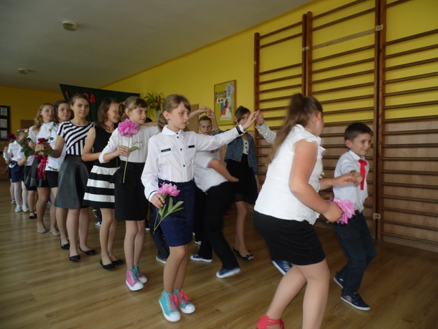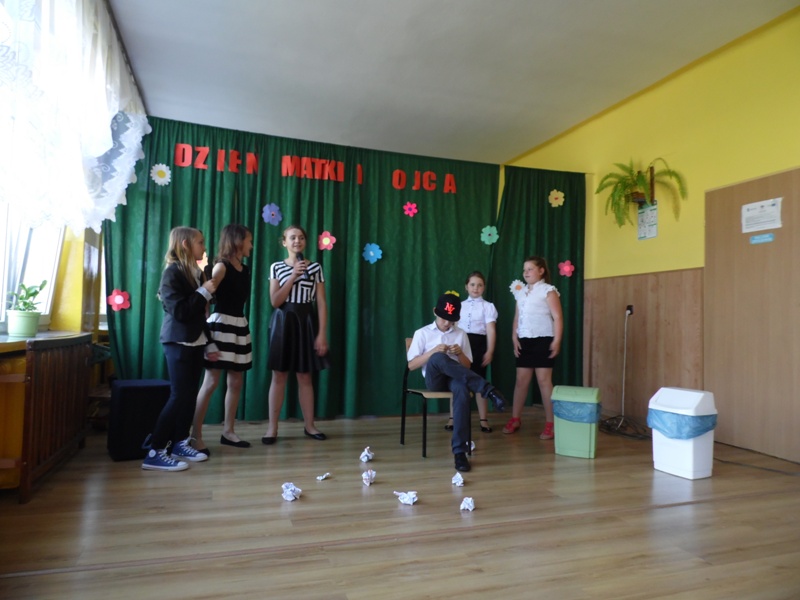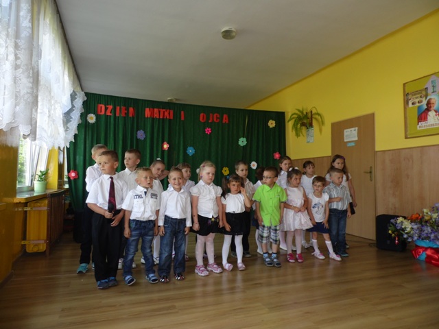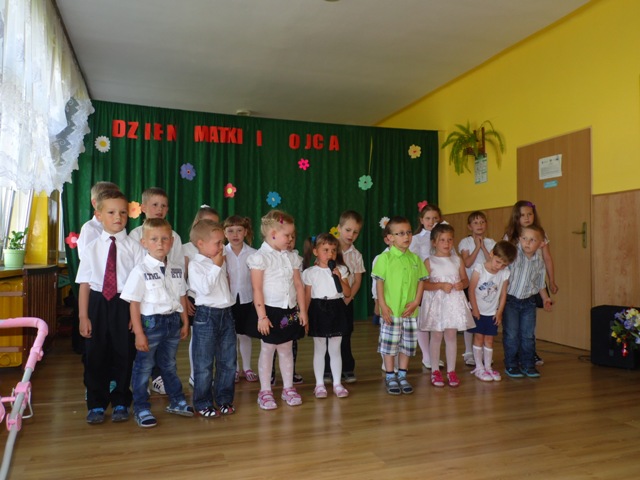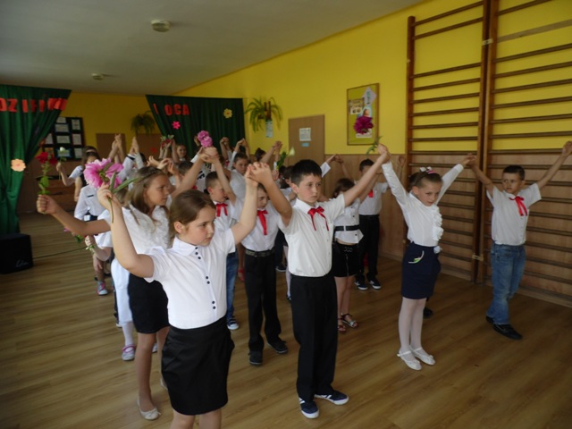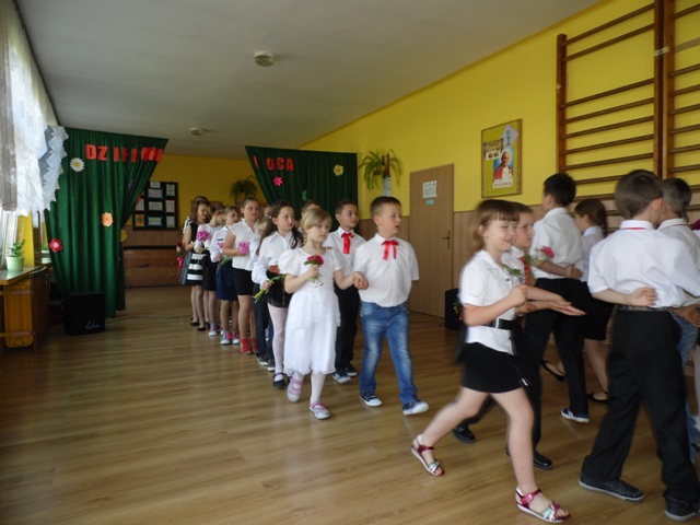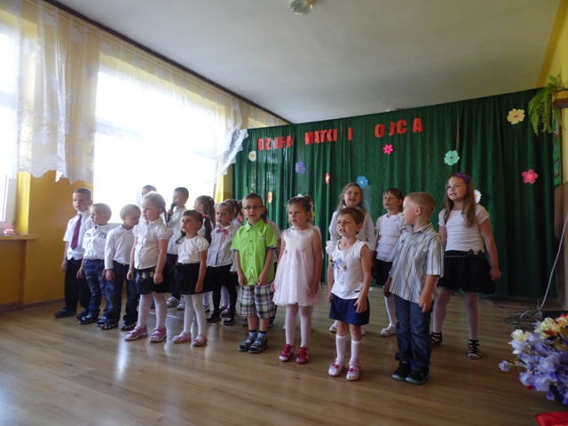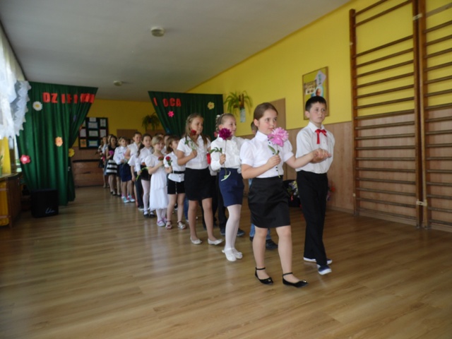 Uroczystość rozpoczęła Pani Dyrektor, witając wszystkich gości i składając im życzenia. Część artystyczna zaczęła się polonezem w wykonaniu dzieci z klas starszych. Następnie przed rodzicami wystąpiły przedszkolaki ze specjalnie przygotowanym programem. O miłości do Mam i Tatusiów mówiły wierszykami i śpiewały piosenkami. Potem dzieci przedstawiły krótką scenkę, wczuwając się w role mam spacerujących ze swoimi pociechami. Niejednym rodzicom łezka zakręciła się w oku. Po występach wszystkie dzieci wręczyły swoim rodzicom samodzielnie wykonane upominki.