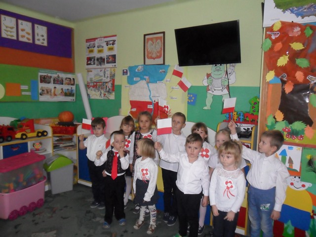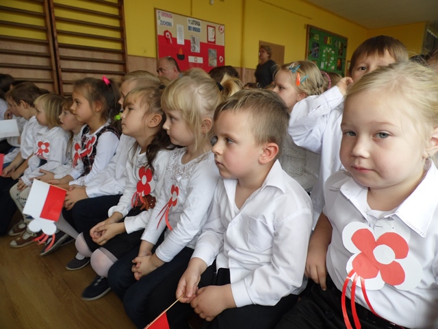Odświętnie ubrani z biało-czerwonymi kwiatami i chorągiewkami z zaciekawieniem wysłuchaliśmy montażu słowno-muzycznego.