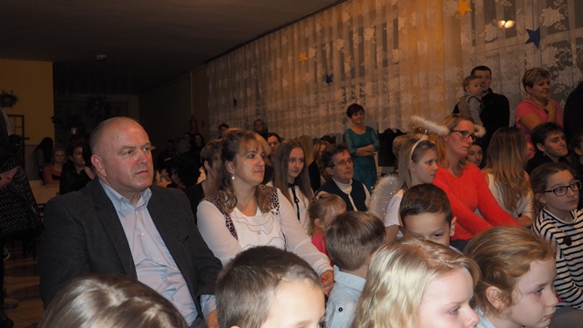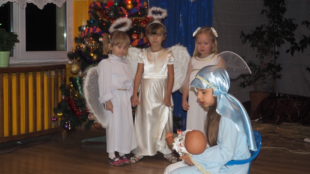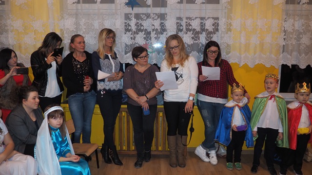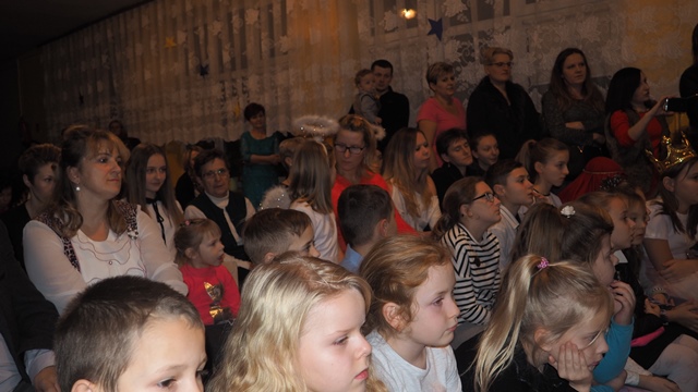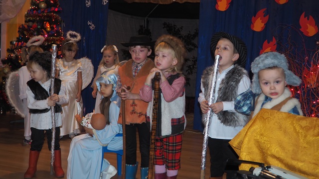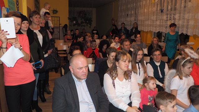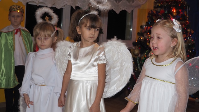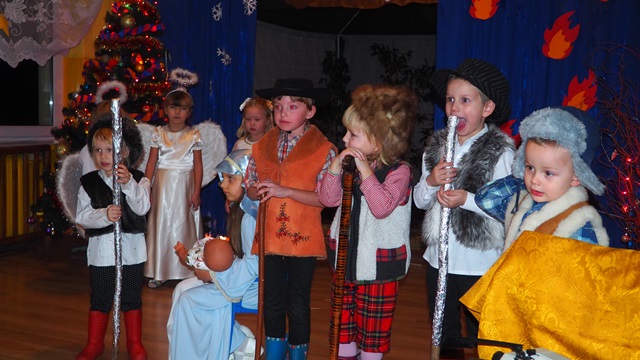 Pięknie przebrani zainscenizowaliśmy dzień narodzin Jezusa. Nasi drodzy rodzice na potrzebę "chwili" utworzyli chór i wspólnie z nami śpiewali nasze polskie, piękne kolędy.