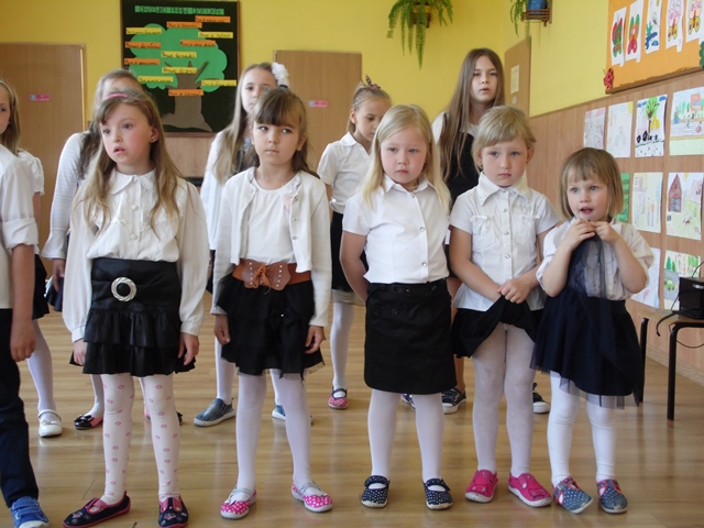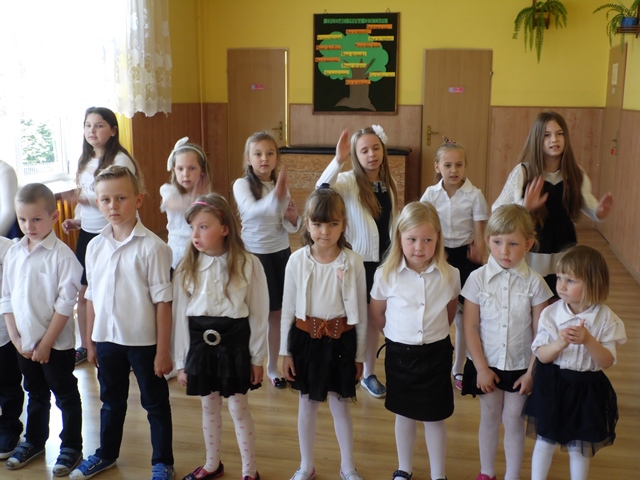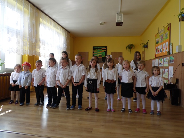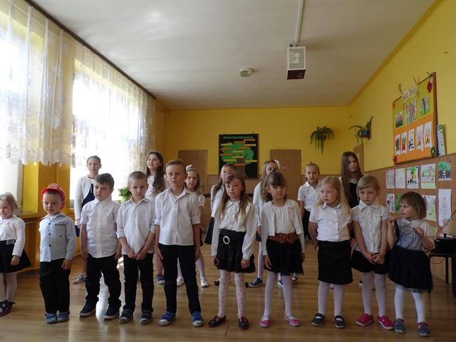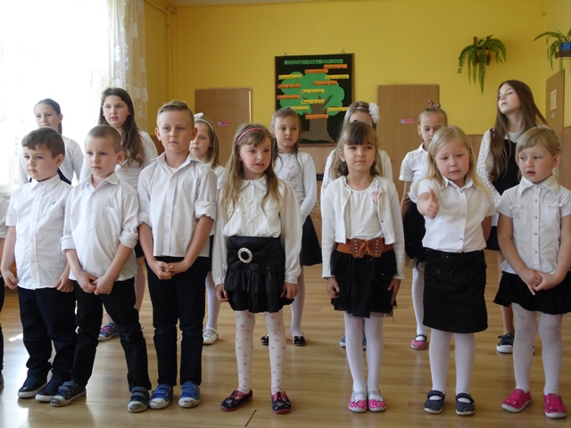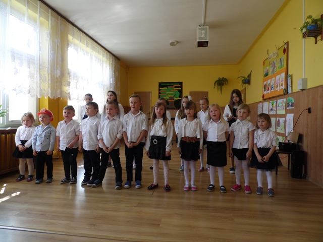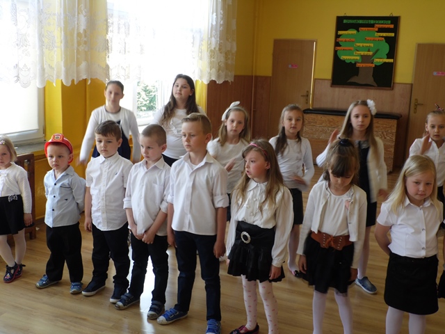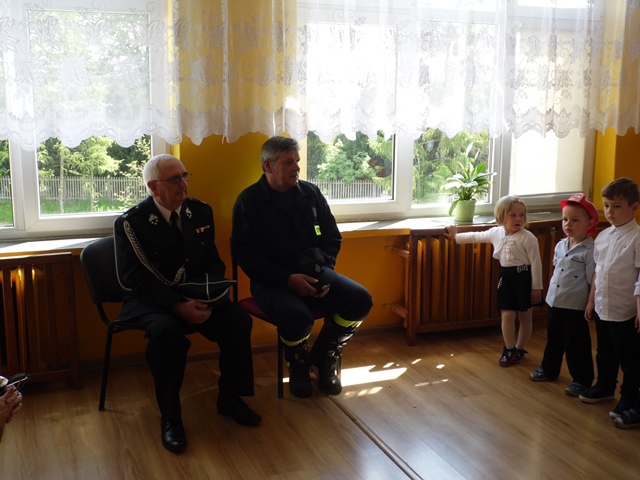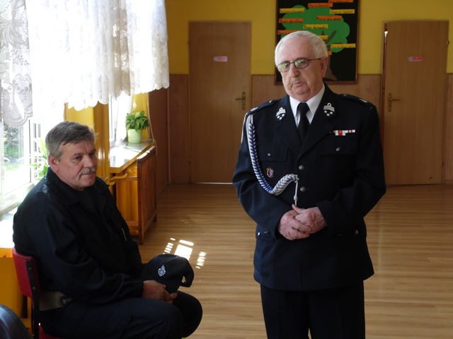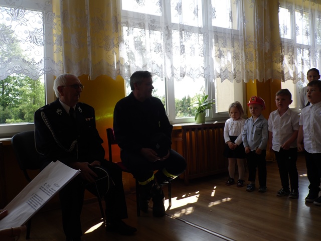 Pan Ostrowski opowiadał zebranym uczniom szkoły i przedszkola o pełnionej przez siebie funkcji. Dzieci z zainteresowaniem wysłuchały tej pogadanki. W podziękowaniu za to spotkanie przedszkolacy uświetniły tę wizytę krótkim występem artystycznym a na koniec uczennice ze szkoły zaśpiewały piosenkę. Panowie otrzymali od dzieci Dyplomy Uśmiechu. Po części artystycznej zostaliśmy zaproszeni na teren remizy i tam druhowie pokazywali nam sprzęt gaśniczy. To był ciekawy poranek.