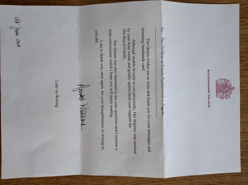 Podczas zajęć z języka angielskiego uczniowie klas IV-VII razem z nauczycielem wpadli na niecodzienny pomysł. Postanowili napisać list do królowej Wielkiej Brytanii, Elżbiety II. Wszyscy chętnie zaangażowali się w prace nad listem. W liście wspomnieliśmy o naszych zainteresowaniach, złożyliśmy życzenia i gratulacje z okazji narodzin nowego członka królewskiej rodziny. Wszyscy z niecierpliwością czekaliśmy na odpowiedź. Po wakacjach naszą szkołę spotkał ogromy zaszczyt. Uczniowie dostali odpowiedź na list. List został podpisany przez lady-in-writing, czyli damę dworu. To właśnie dama dworu w imieniu Królowej dziękuje za list, życzenia i ogromne zainteresowanie pałacem i życiem w nim. Do listu dołączony został informator, który odpowiada na wiele naszych pytań. List wzbudził ogromne emocje.
