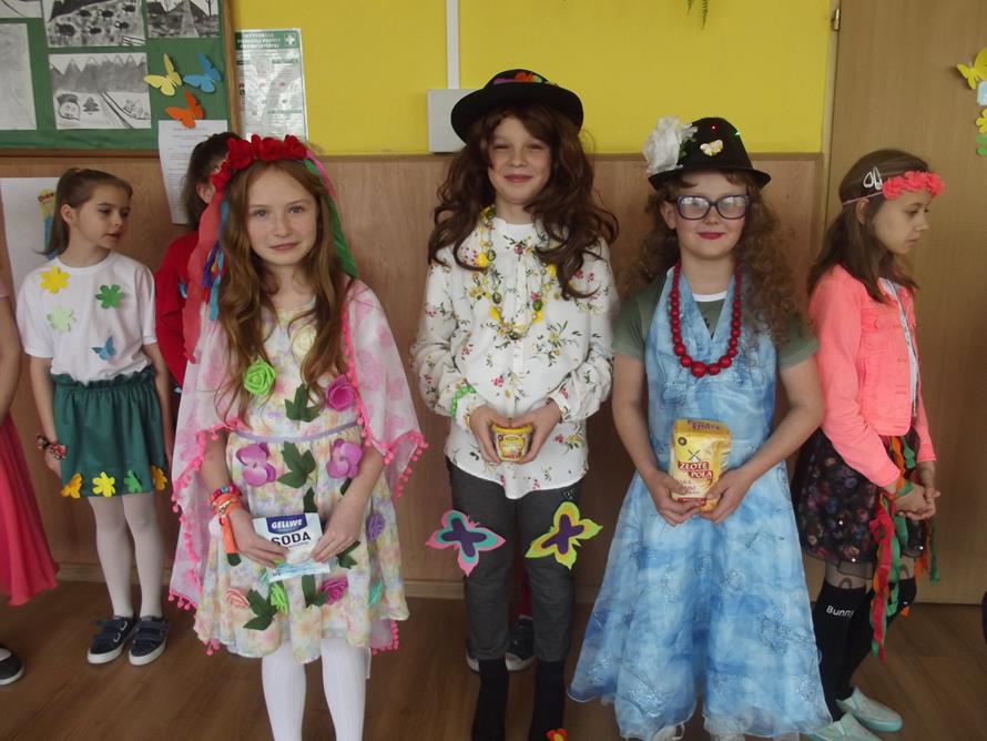Jak co roku Samorząd Uczniowski zorganizował konkurs na „Najfajniejszy wiosenny strój”. Już od rana na korytarzach szkolnych uczniowie prezentowali barwne i pomysłowe stroje. Tyle wiosny i radości nie było u nas przez całą zimę. Jury miało nie lada wyzwanie wybrać spośród wszystkich kreacji te najpiękniejsze, ale udało się. Wyniki przedstawiają się następująco: