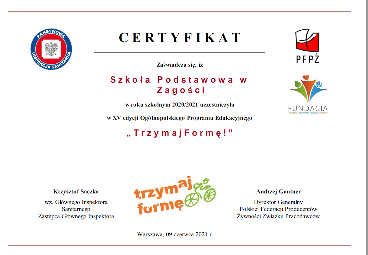 Jak co roku w naszej szkole realizowany jest program „Trzymaj Formę”, którego celem jest promowanie zdrowego stylu życia poprzez propagowanie zbilansowanej diety oraz regularnej aktywności fizycznej. Jest to Ogólnopolski Program Edukacyjny współorganizowany przez Główny Inspektorat Sanitarny oraz Polską Federację Producentów Żywności Związek Pracodawców a naszym szkolnym koordynatorem programu jest pani Katarzyna Jagiełła.