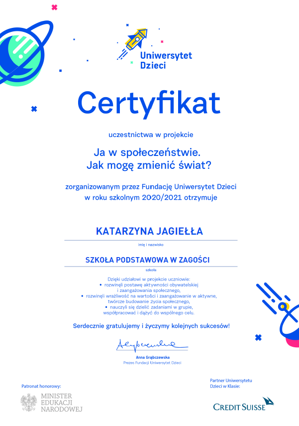 W roku szkolnym 2020/2021 mimo trwającej pandemii klasa VI i VII pod opieką wychowawcy pani Katarzyny Jagiełły wzięła udział w projekcie „Uniwersytet dzieci w klasie” pod patronatem Ministerstwa Edukacji Narodowej pt.: „Ja w społeczeństwie. Jak mogę zmienić świat?”.
