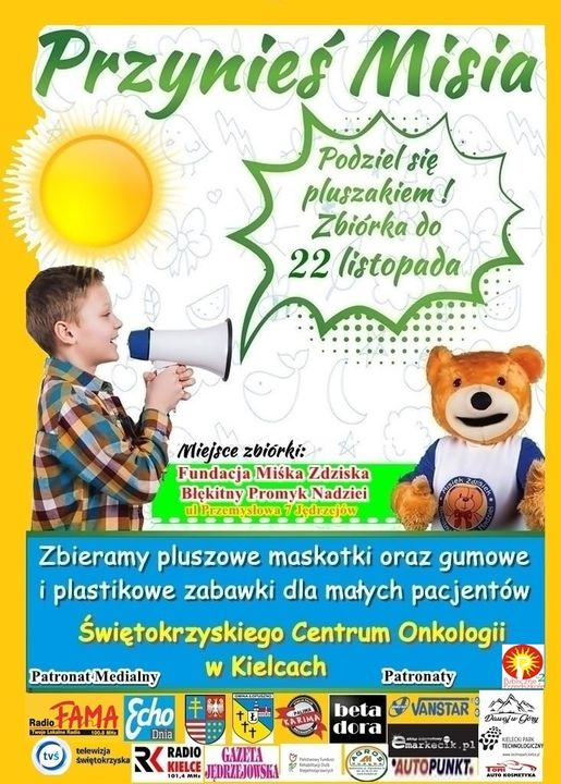 Kochani Uczniowie i Drodzy Rodzice, chcielibyśmy Was poinformować, że w naszej szkole ruszyła zbiórka pluszowych maskotek i plastikowych zabawek dla chorych dzieci ze Świętokrzyskiego Centrum Onkologii w Kielcach z okazji zbliżającego się Światowego Dnia Pluszowego Misia – 25 listopada. Dlatego jako społeczność szkolna pragnęlibyśmy dołożyć swoją cegiełkę na tak szczytny cel. Dając tym samym wyraz naszej empatii i chęci niesienia pomocy.