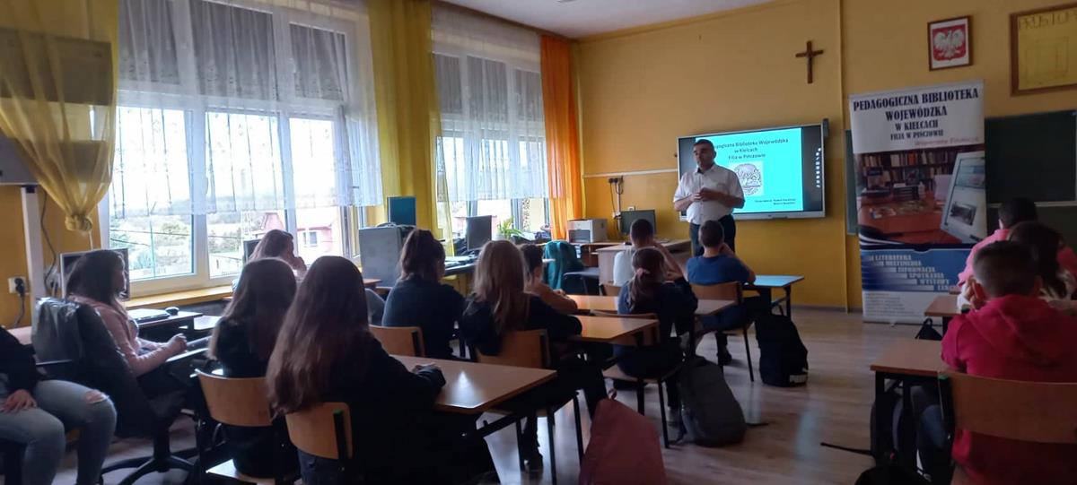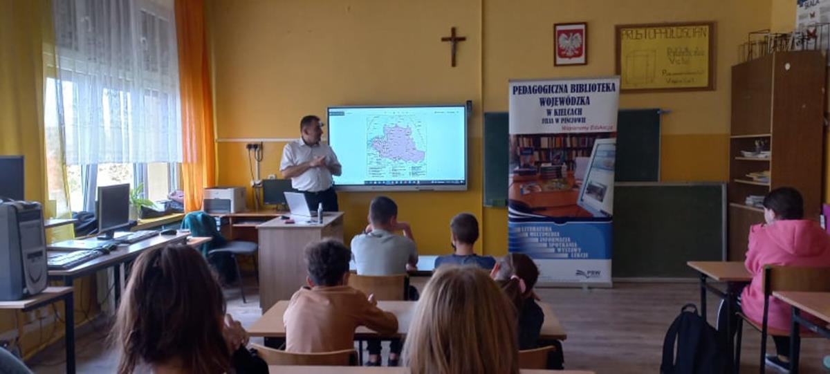 W dniu 07.10.2021 naszą szkołę odwiedził Pan Marcin Salomon - pracownik Pedagogicznej Biblioteki Wojewódzkiej w Kielcach Filia w Pińczowie. Pan Marcin przestawił uczniom klas VI-VIII zagadnienie dotyczące „Wojen obronnych Rzeczypospolitej w XVII wieku”. Temat nie przypadkowy bowiem nasza szkoła przystąpiła do Powiatowego Konkursu Historycznego „Wojny obronne Rzeczpospolitej w XVII wieku” przeznaczony dla uczniów klas IV-VIII ze szkół podstawowych z obszaru powiatu pińczowskiego. Dziękujemy za ciekawe i merytoryczne spotkanie.