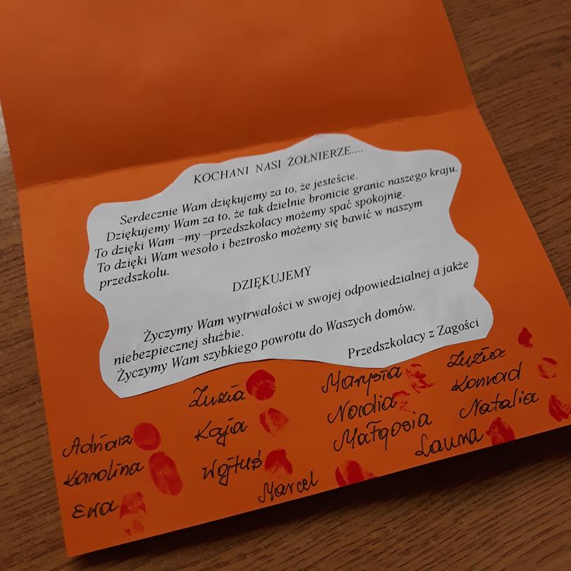Tej treści kartkę ze słowami wsparcia wysłaliśmy do żołnierzy broniących nasz kraj .