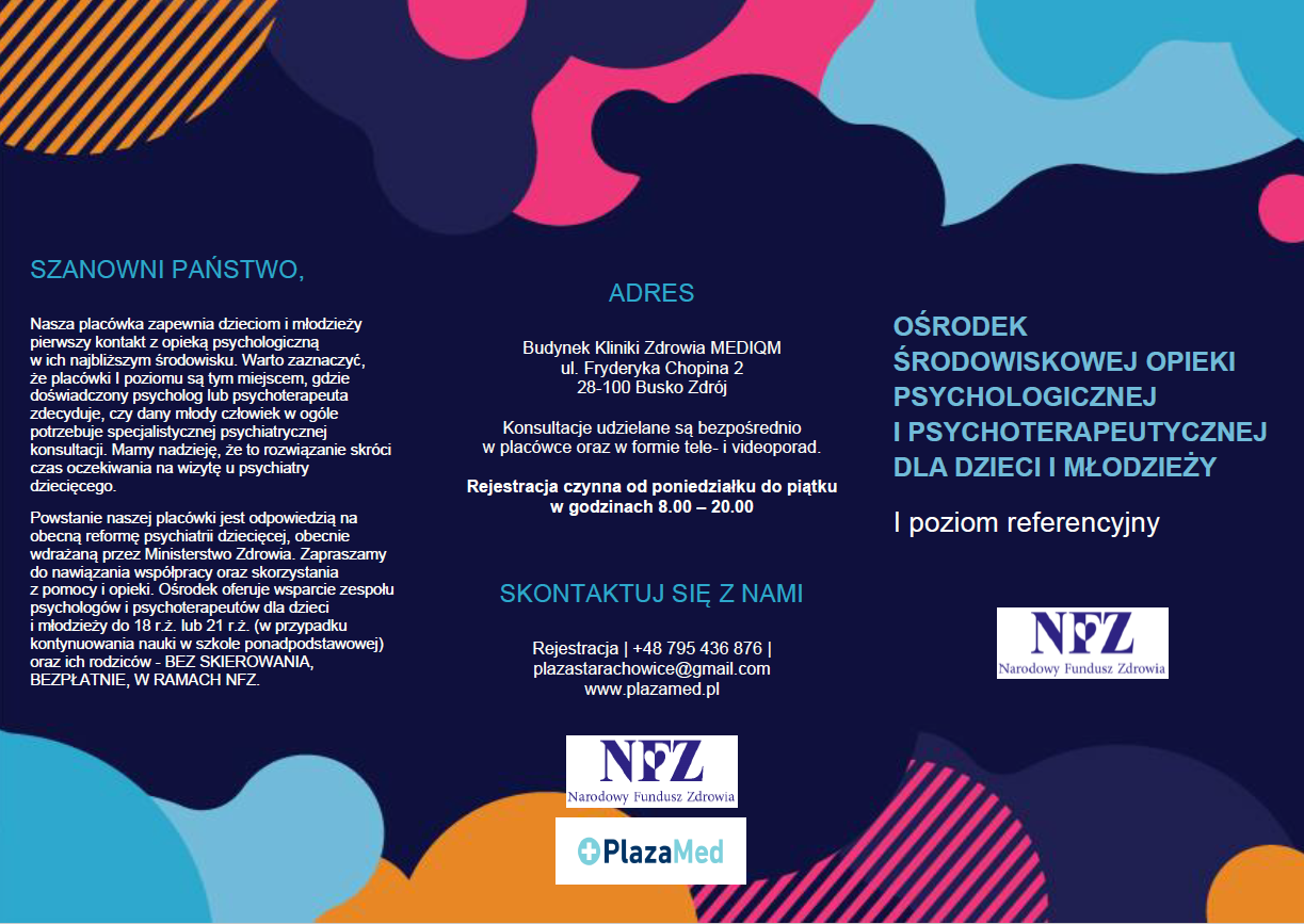 Informujemy, że od września bieżącego roku w budynku Kliniki Zdrowia Mediqm na ul. Fryderyka Chopina 2 w Busku-Zdroju, rozpoczął swoją działalność Ośrodek Środowiskowej Opieki Psychologicznej i Psychoterapeutycznej dla Dzieci i Młodzieży (I poziom referencyjny). Ośrodek oferuje wsparcie zespołu psychologów i psychoterapeutów dla dzieci i młodzieży do 18r.ż. lub 21r.ż. (w przypadku kontynuowania nauki w szkole ponadpodstawowej) oraz ich rodziców - bez skierowania, bezpłatnie, w ramach NFZ.