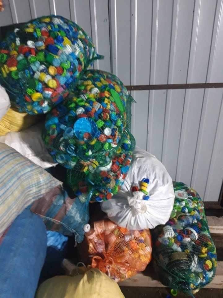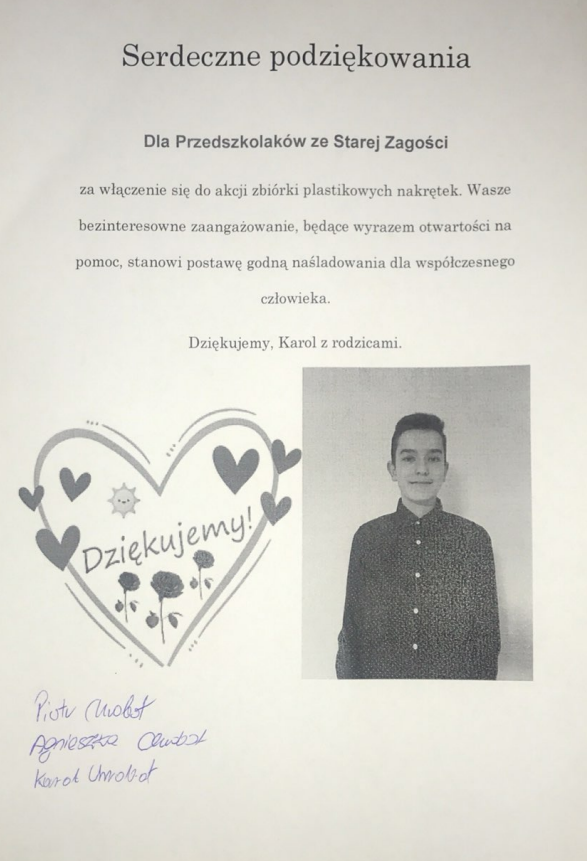Wręczyliśmy Karolowi 21 worków nakrętek.