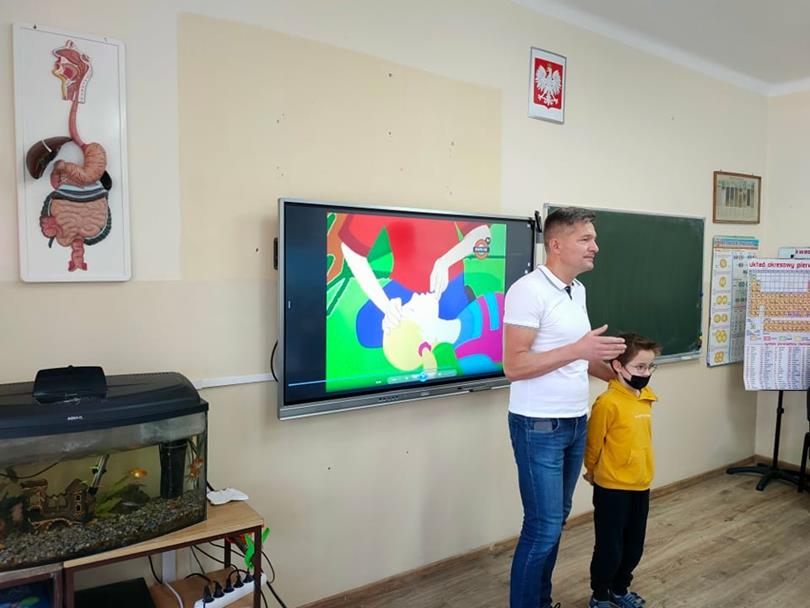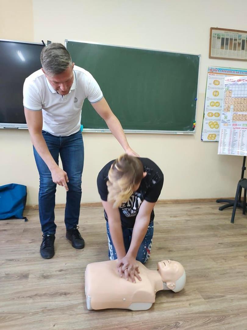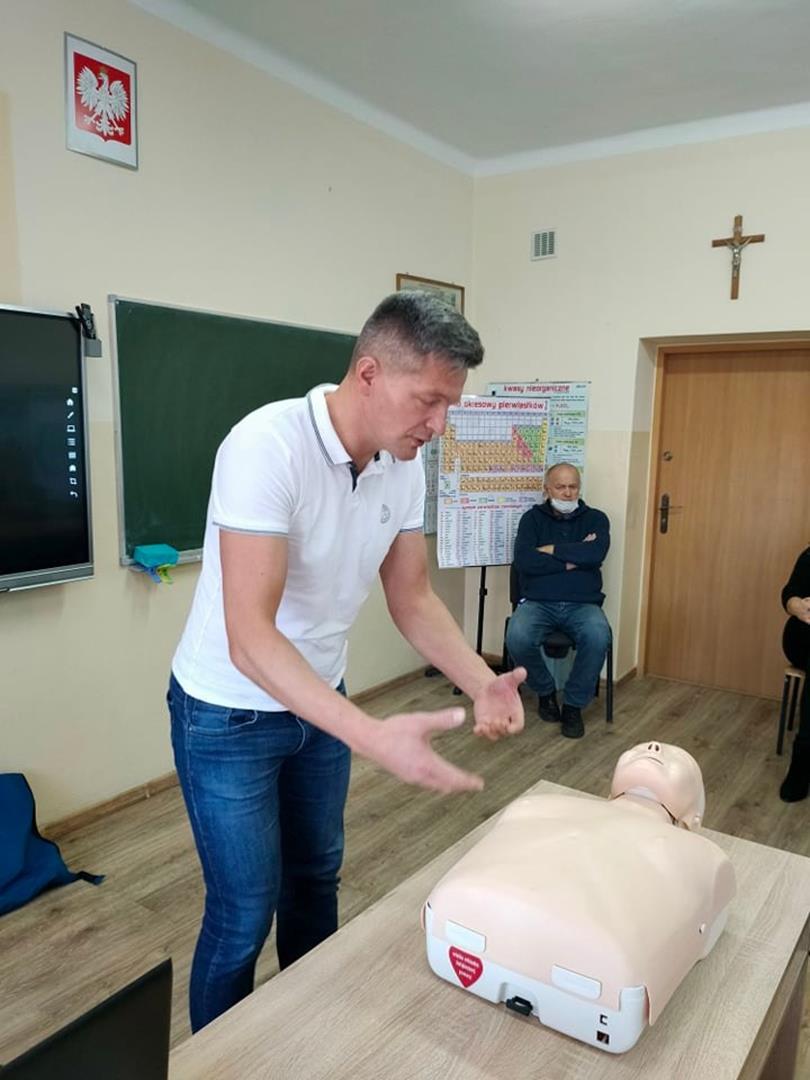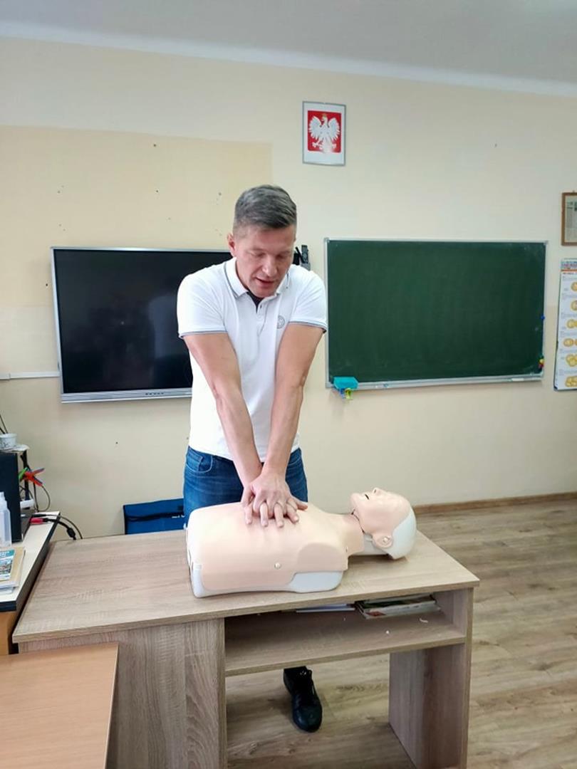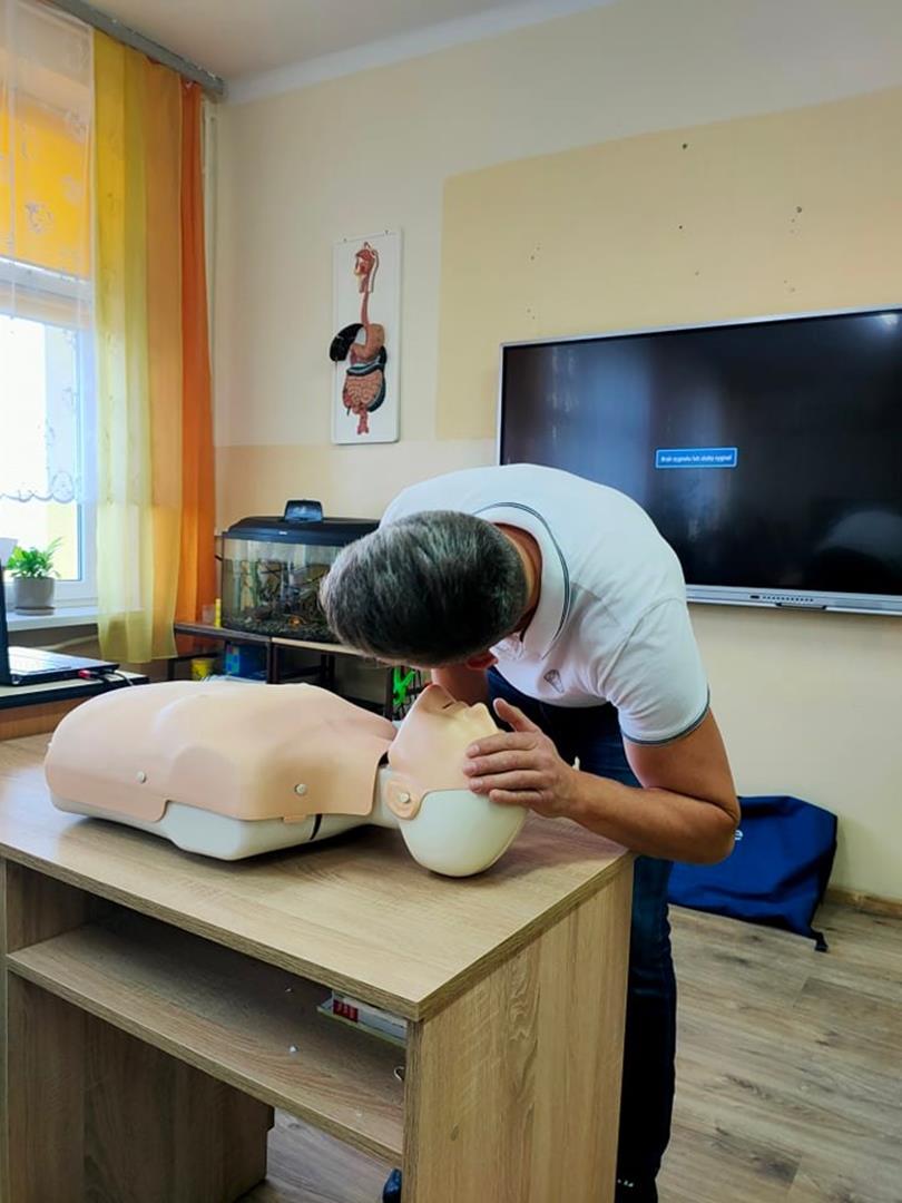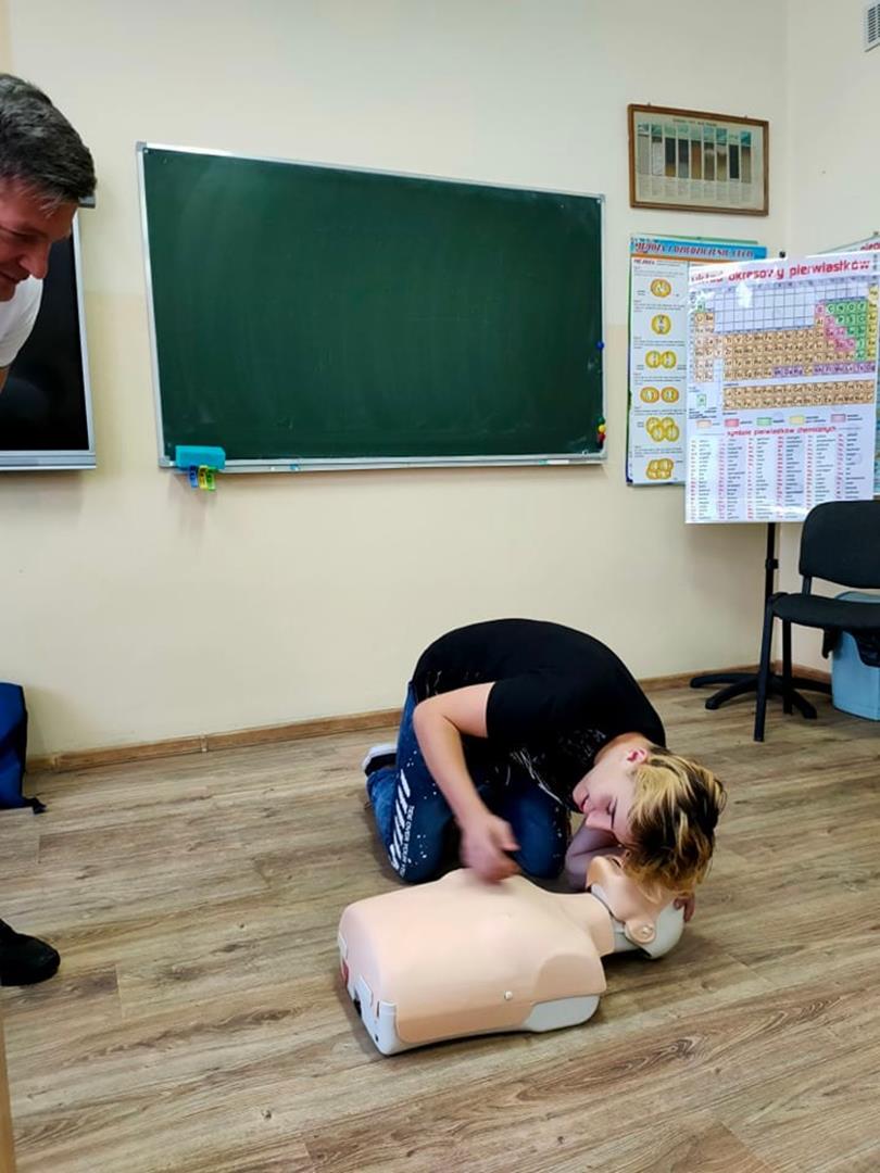 Zajęcia z zakresu pierwszej pomocy rozpoczęły się od filmu rysunkowego „Doktor Kręciołek”. Następnie przeszły w ćwiczenia praktyczne, które poprowadził nasz nauczyciel Edukacji dla bezpieczeństwa - pan Marek Sobura. Uczniowie przypomnieli sobie numery alarmowe oraz zasady postępowania w sytuacji udzielania pierwszej pomocy przedmedycznej. Ćwiczyli symulowaną rozmowę z dyspozytorem pogotowia oraz resuscytacje krążeniowo-oddechową na fantomie.