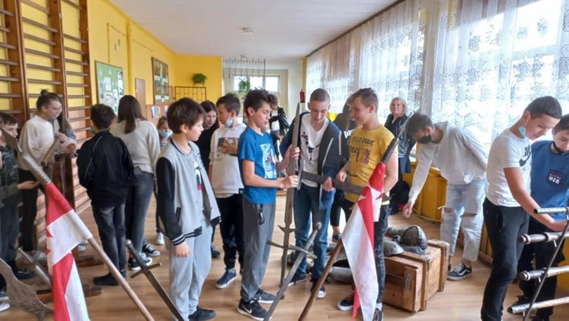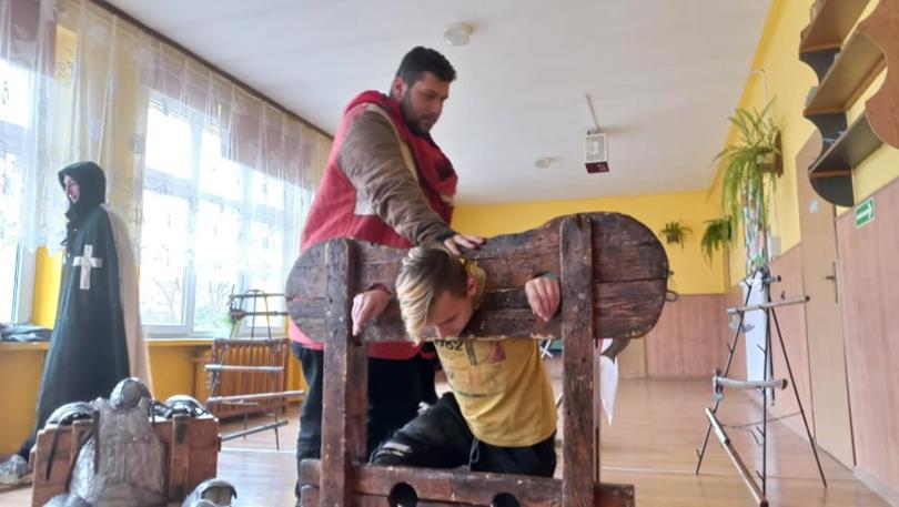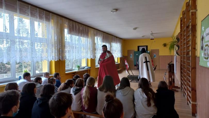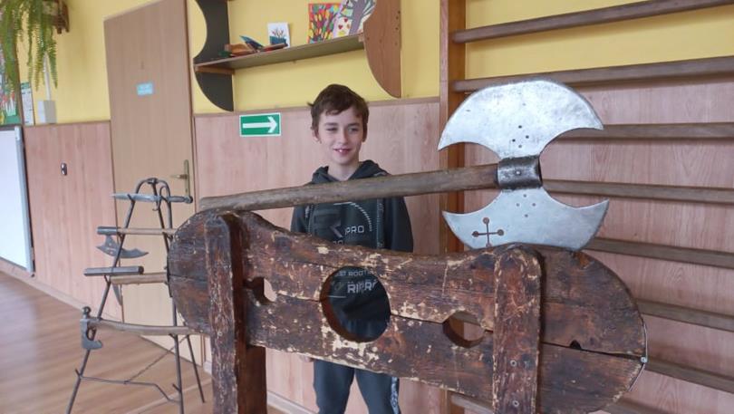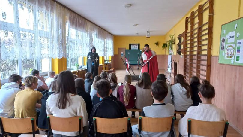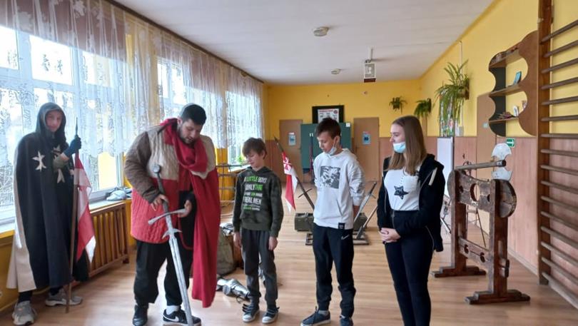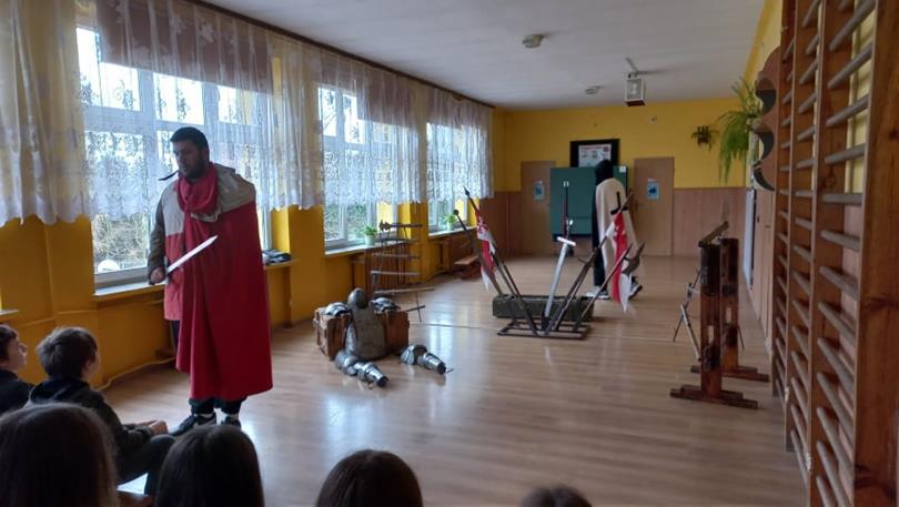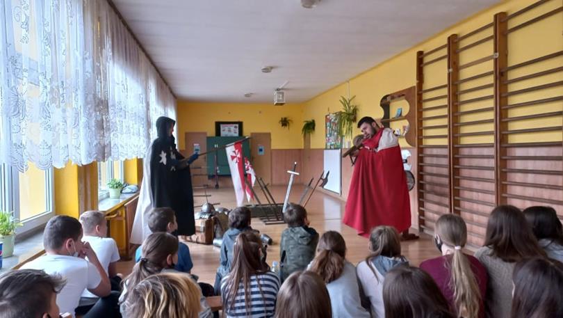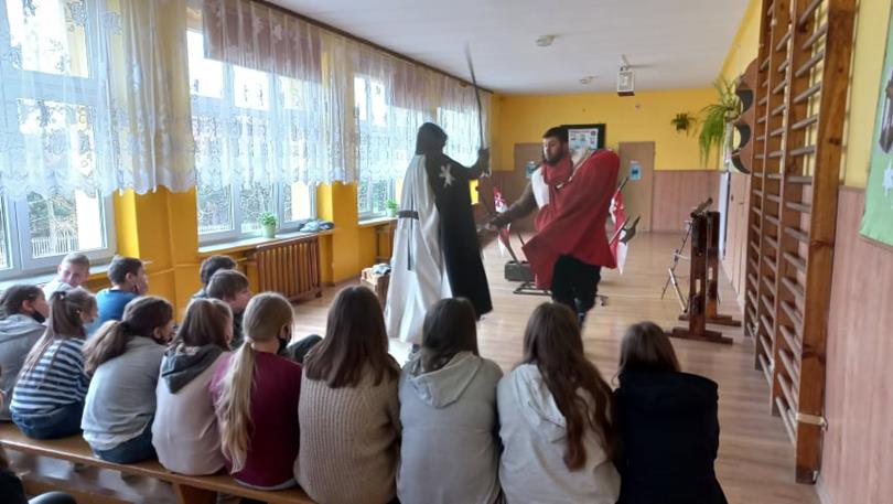 30.11.2021 r. w naszej szkole odbyła się niecodzienna lekcja historii „Życie i Kultura w Średniowieczu”. Zaprezentowała ją Grupa Artystyczna Rekonstrukto. Podczas spektaklu uczniowie naszej szkoły dowiedzieli się wiele cennych i ciekawych informacji na temat życia w średniowiecznej Polsce. Uczniowie naszej szkoły mieli okazję zobaczyć jak wyglądało rycerskie uzbrojenie i ekwipunek. Grupa Rekonstrukto zapoznała uczniów także ze średniowiecznym prawem i karami. Na własnej skórze niektórzy mogli się przekonać, jak były one dotkliwe. Niektórzy uczniowie – ochotnicy przeszli próbę „ciężkiego miecza”. Można było również zobaczyć, dotknąć i wypróbować używaną przez rycerzy broń.