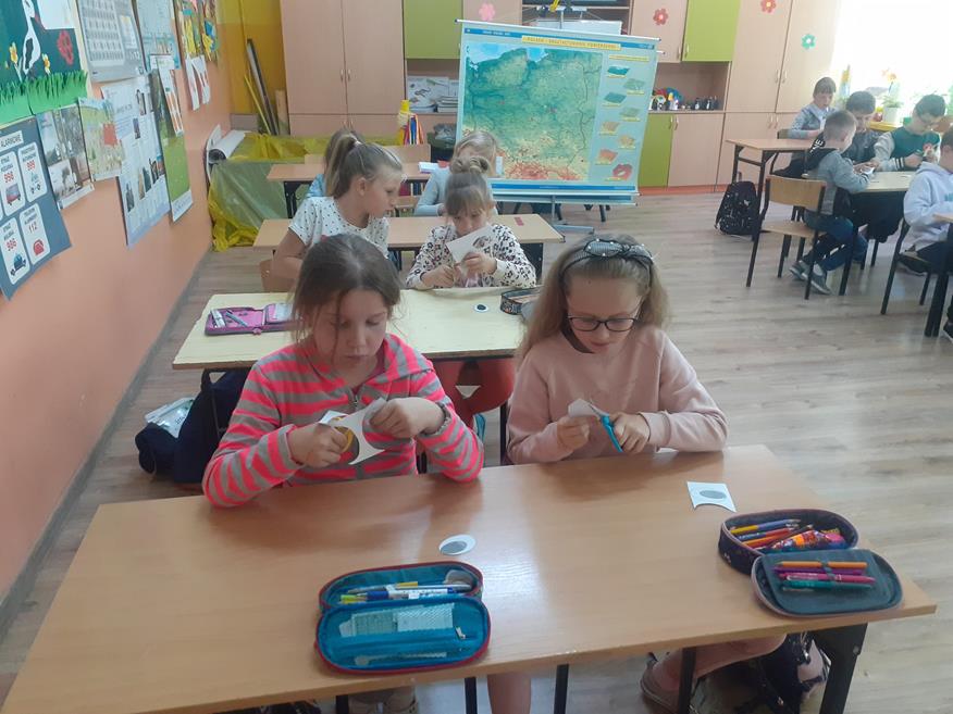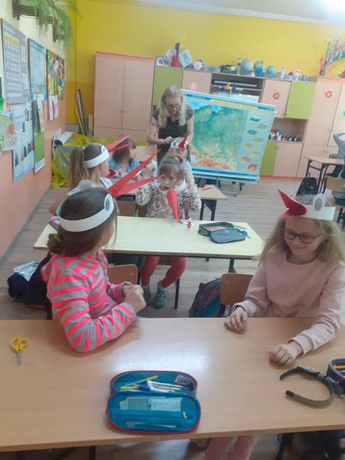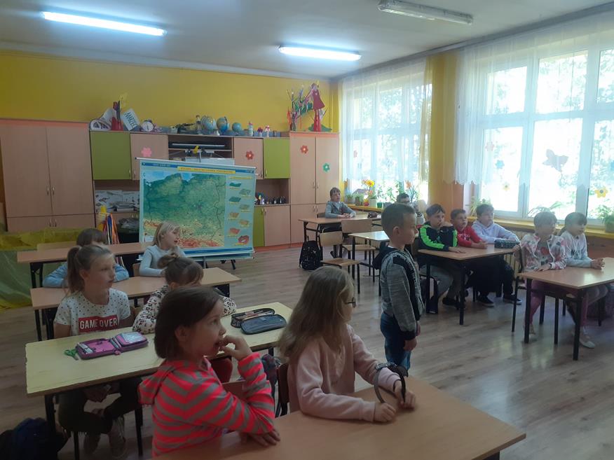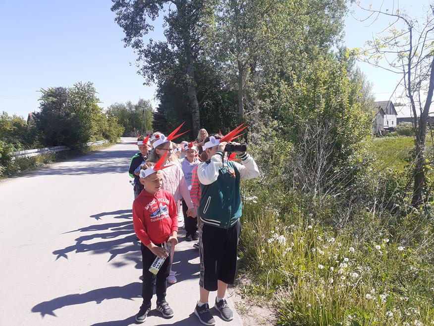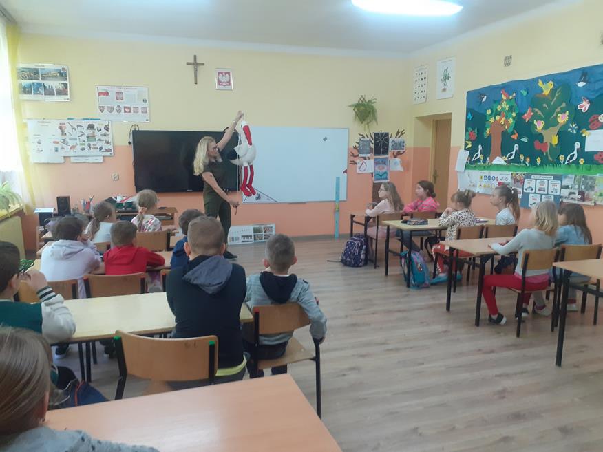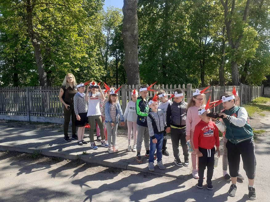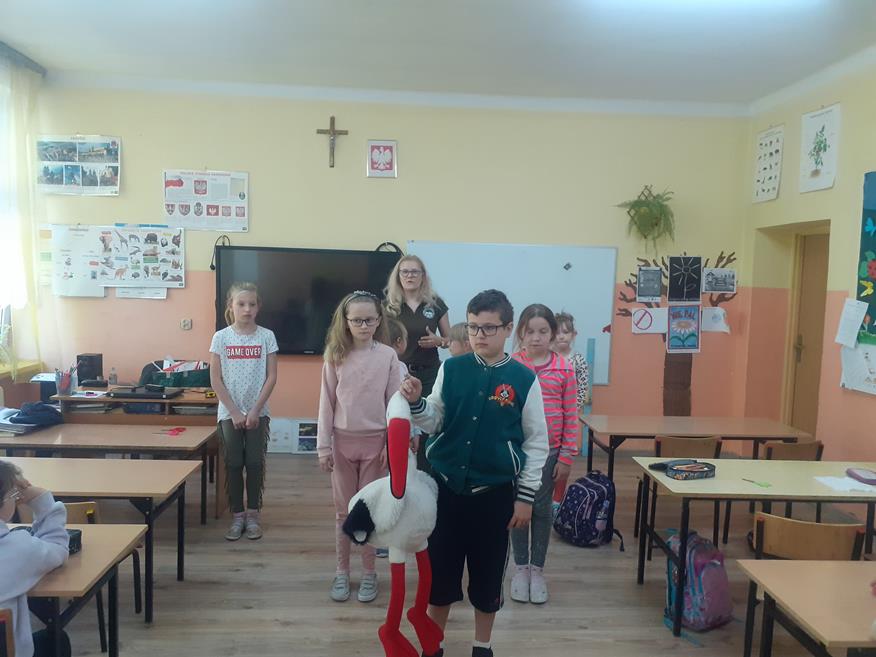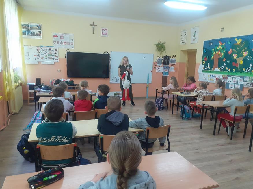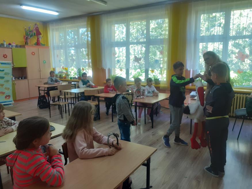 Dnia 18 maja uczniów klas I - III odwiedziła przedstawicielka Zespołu Świętokrzyskich i Nadnidziańskich Parków Krajobrazowych Pani Magdalena Skrzypek. Pani Magda bardzo ciekawie opowiadała o życiu, wyglądzie i zwyczajach białych i czarnych bocianów. Uczniowie z zainteresowaniem słuchali opowieści o bocianach. Utworzyli również klucz, w jakim lecą te ptaki oraz wykonali bardzo fajne opaski. Następnie z piosenką na ustach wszyscy wyruszyli na spotkanie z bocianem. Idąc drogą uczniowie obserwowali przyrodę oraz wiosenne prace polowe. Po dotarciu na miejsce, zobaczyli bociana w gnieździe. Wszyscy w ciszy i skupieniu podziwiali bohatera, który spoglądał na nich z góry. Chyba był zadowolony z tych odwiedzin? Pozwolił się nawet fotografować. Później wszyscy bawili się na pobliskiej polance i słuchali przysłów o bocianach. Następnie pożegnali bociana i wrócili do szkoły. Podziękowali Pani Madzi za odwiedziny, bardzo fajną zabawę i zaprosili na kolejne zajęcia.