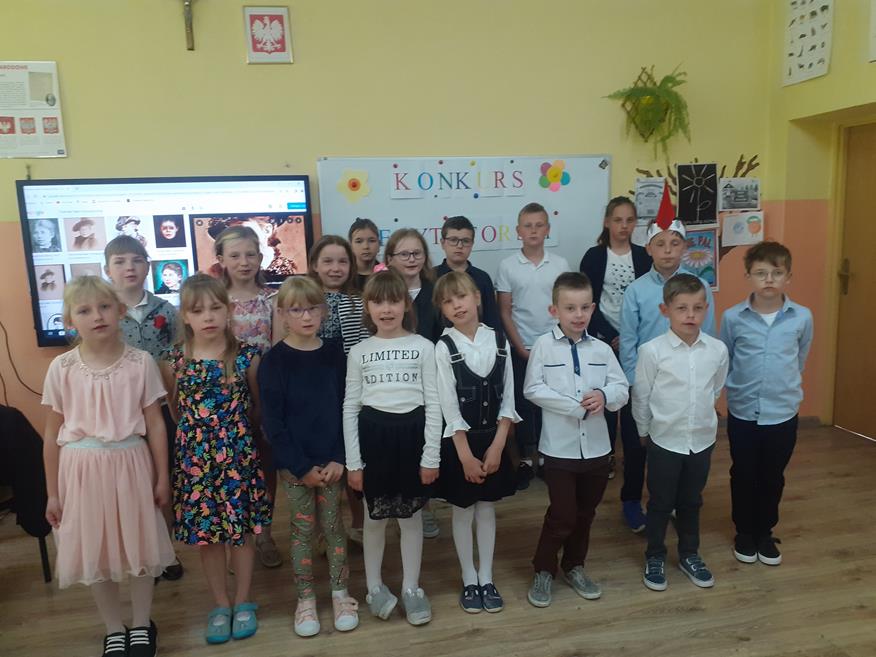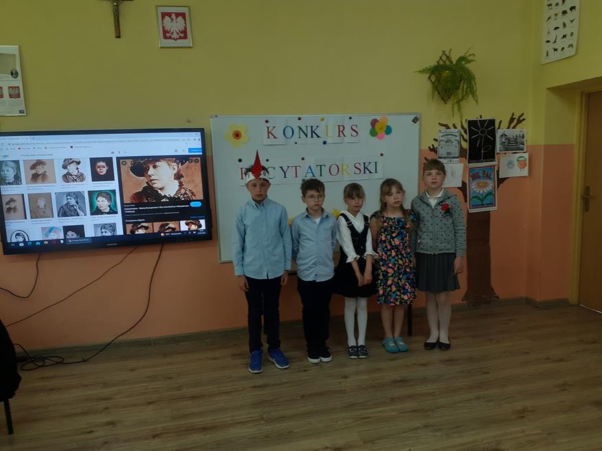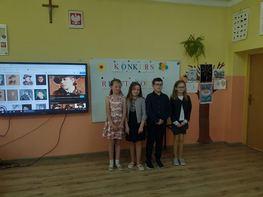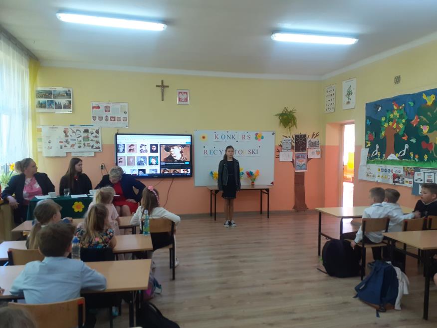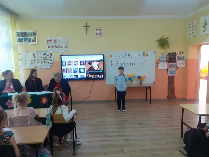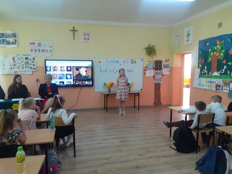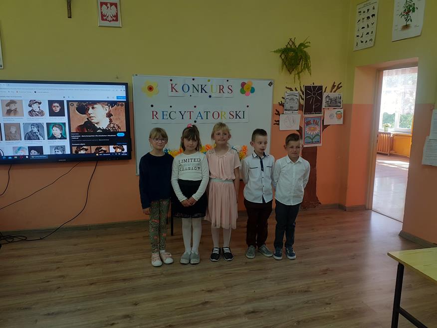Dnia 19 maja w naszej szkole odbył się konkurs recytatorski. Uczniowie z klas I - III i klasy V recytowali utwory Marii Konopnickiej. Prezentacjom przygotowanym przez 17 uczniów przysłuchiwało się jury konkursowe w składzie: Pani Dyrektor Teresa Zawartka, Pani Przewodnicząca Rady Rodziców Aneta Siudy oraz Przewodnicząca Samorządu Uczniowskiego Anna Pruś. Po wysłuchaniu wszystkich prezentacji wyłoniono 4 najładniej recytujące osoby, które będą reprezentowały naszą szkołę w gminnym etapie konkursu w PSCK.