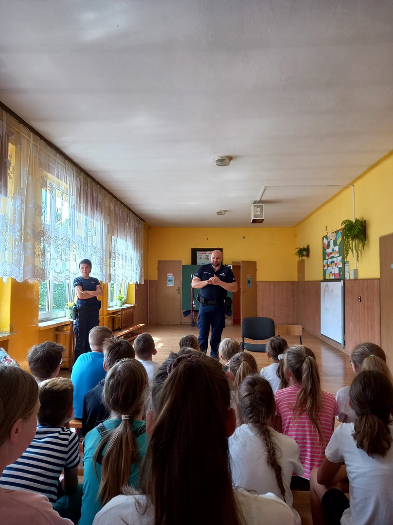 Zbliża się okres wakacji, dlatego do naszej szkoły zawitali przedstawiciele Komendy Powiatowej Policji w Pińczowie, którzy przypomnieli uczniom naszej szkoły zasady bezpiecznego zachowania podczas letniego wypoczynku. Dzielnicowy wygłosił prelekcje na temat bezpiecznych zachowań dzieci w różnych sytuacjach w okresie wakacji. Przedstawił zasady bezpiecznego poruszania się na drodze i właściwego przechodzenia przez jezdnię. Funkcjonariusze przestrzegali również uczniów przed korzystaniem z niestrzeżonych kąpielisk i organizowaniem zabaw w niebezpiecznych miejscach. Przypomnieli również zasady ograniczonego zaufania w stosunku do obcych osób.