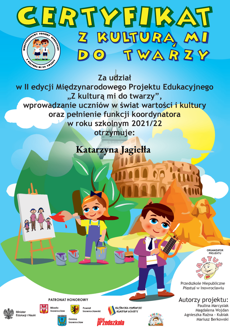 Na początku roku szkolnego 2021/2022 uczniowie klasy ósmej wraz z wychowawcą przyłączyli się do II edycji Międzynarodowego Projektu Edukacyjnego „Z kulturą mi do twarzy”, pod patronatem honorowym m.in. Ministra Edukacji i Nauki.