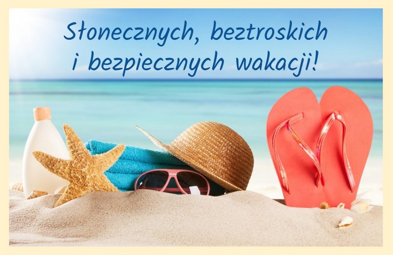 Życzymy wszystkim, aby rozpoczęte wakacje były pełne niezapomnianych wrażeń, udanego i bezpiecznego wypoczynku. Cieszcie się z każdego słonecznego dnia, z każdej przeżytej przygody, z każdego spotkania z interesującymi ludźmi. Odpoczywajcie w pełnym słońcu i przy ładnej pogodzie, nabierajcie sił i „ładujcie akumulatory”, ale z zachowaniem wszelkich zasad bezpieczeństwa.
