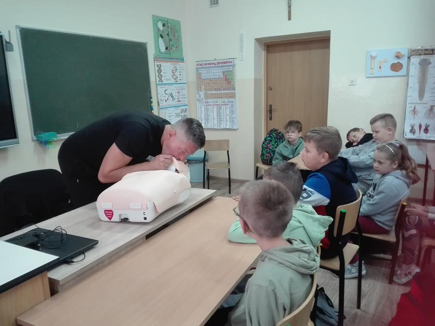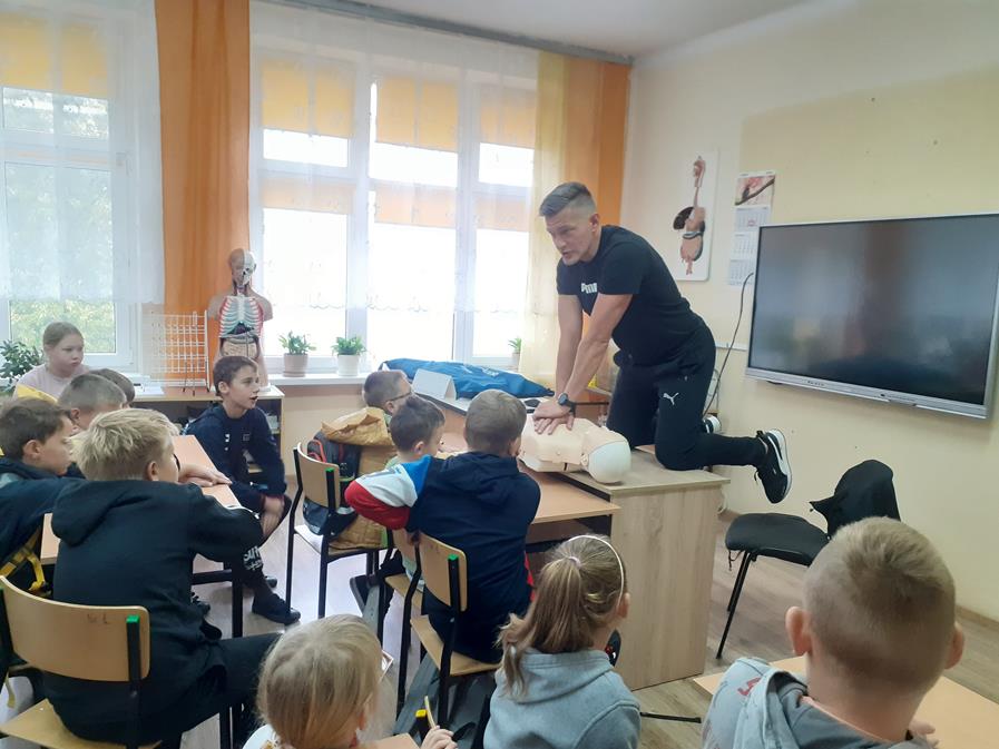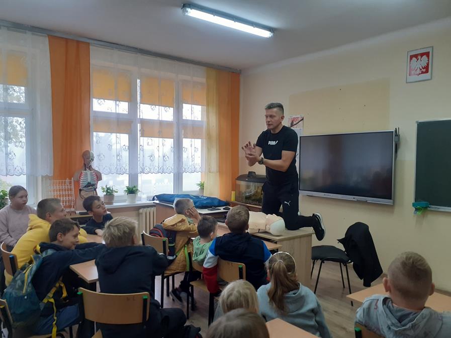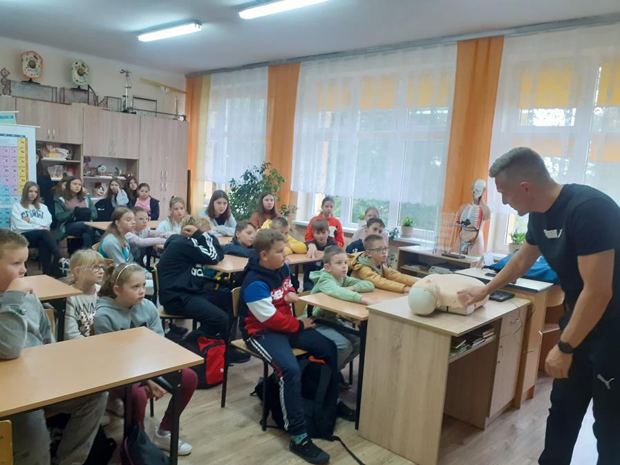 Dnia 27 września w ramach Programu Edukacyjnego ,, Ratujemy i Uczymy Ratować " w naszej szkole odbyły się zajęcia warsztatowe dla uczniów klas I - VIII. Poprowadził je nauczyciel Edukacji dla bezpieczeństwa - pan Marek Sobura. Uczniowie przypomnieli sobie zasady udzielania pierwszej pomocy oraz podstawowe numery alarmowe. Ćwiczyli resuscytację krążeniowo - oddechową na fantomie. Celem zajęć było podniesienie wśród uczniów wiedzy i umiejętności z zakresu podstawowych czynności ratujących życie.