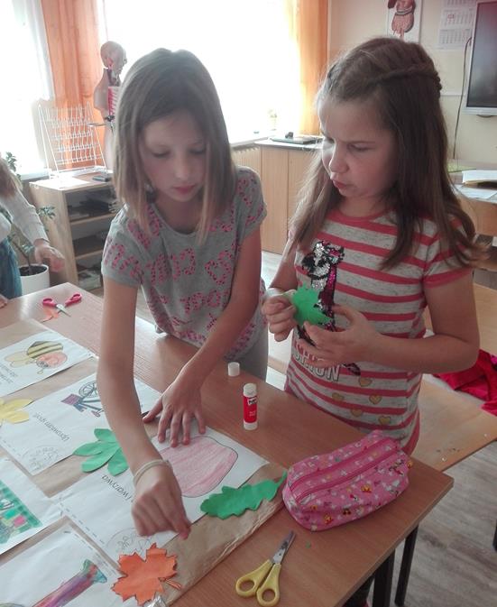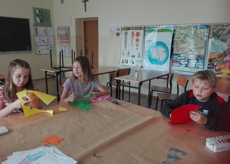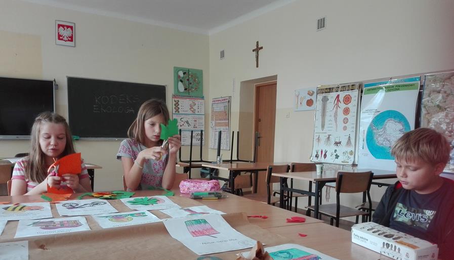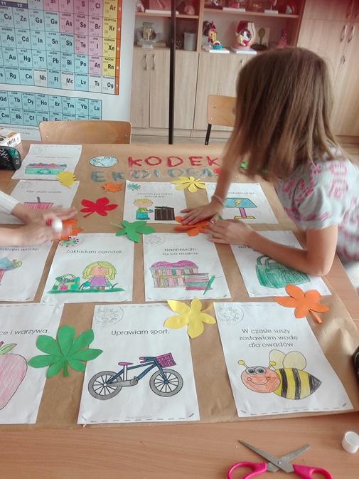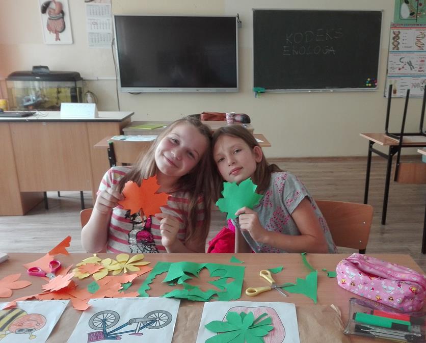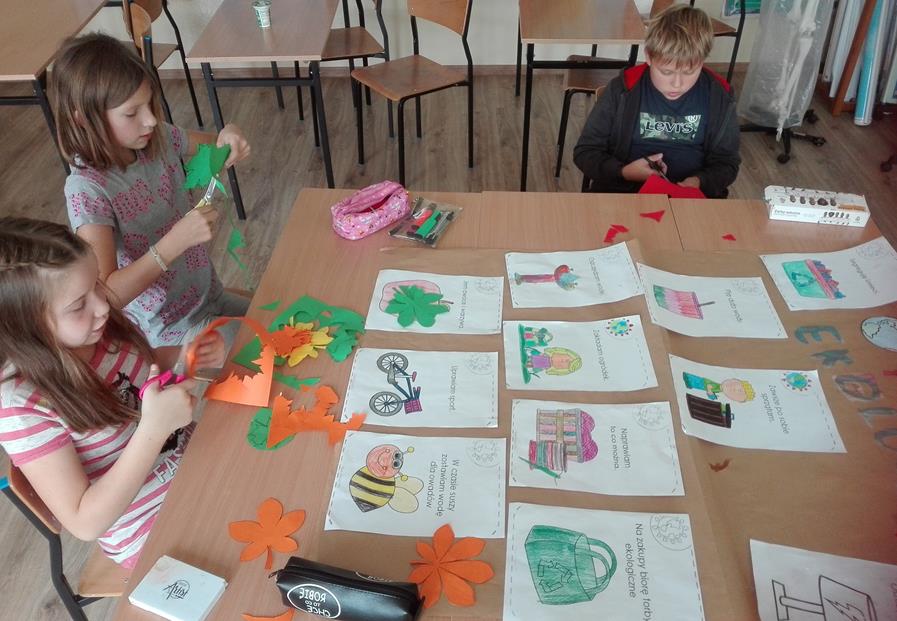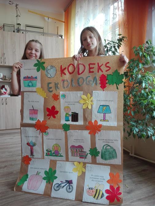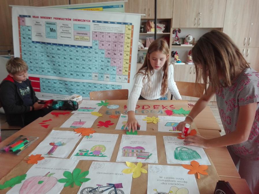 W dniu 5 października, na zajęciach z koła krajoznawczo – turystycznego uczniowie z klasy czwartej tworzyli „Kodeks ekologa” czyli zbiór wszystkich zasad, którymi powinien kierować się w życiu i według których postępować prawdziwy młody człowiek mający na względzie dobro naszej planety. Uczniowie najpierw kolorowali rysunki obrazujące poszczególne reguły tj.: segregacja śmieci, oszczędzanie wody i prądu, naprawianie a nie wyrzucanie czy w czasie suszy zostawianie wody dla owadów. Następnie zaprojektowali napis wykonany farbami oraz wycinali jesienne liście. Kolejnym krokiem było przyklejenie wszystkich informacji i dekoracji na dużym arkuszu papieru, tak aby powstał ekologiczny plakat. Etapy pracy uczniów można śledzić na zdjęciach poniżej.