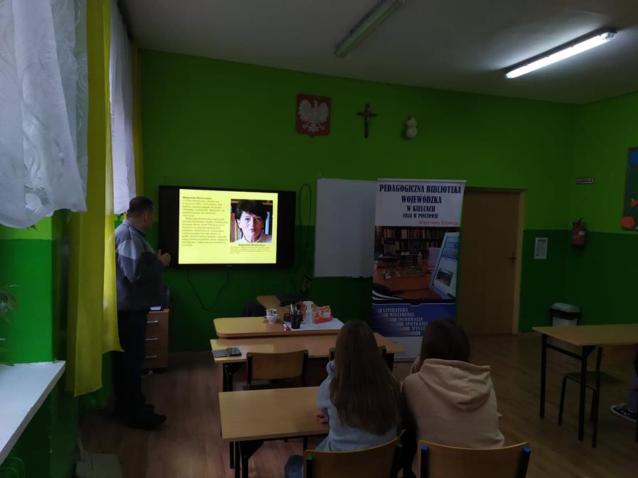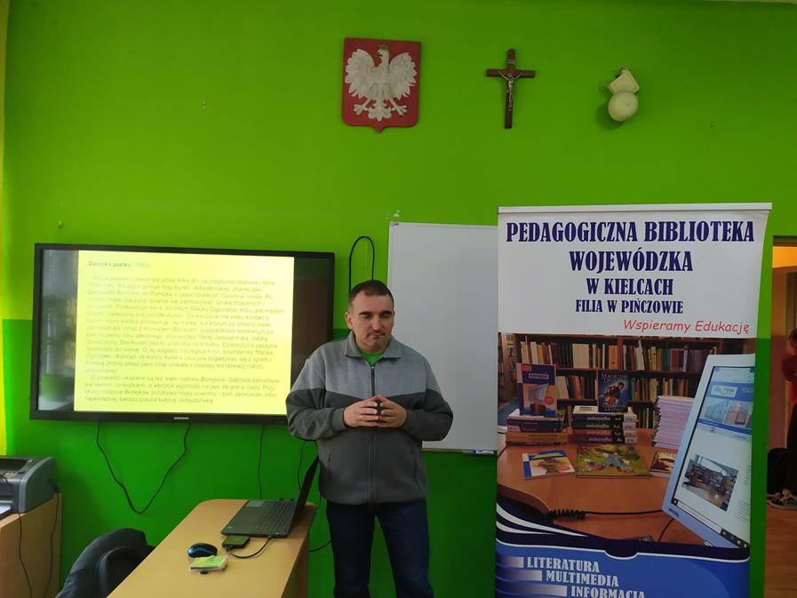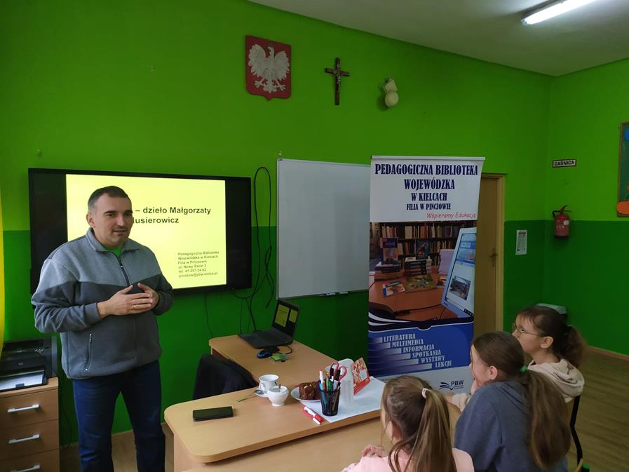 24 października nauczyciel-bibliotekarz Pedagogicznej Biblioteki Wojewódzkiej w Kielcach Filia Pińczów – p. Marcin Salamon przeprowadził dla uczniów klas IV-VIII lekcje biblioteczne połączone z prezentacją multimedialną własnego autorstwa dotyczącą serii „Jeżycjada” Małgorzaty Musierowicz .Wspomniana „Jeżycjada” to określenie serii powieści wspomnianej autorki zapoczątkowanej przed 45 laty – w 1977 r. i kontynuowanej do dziś. Nazwa pochodzi od poznańskiej dzielnicy Jeżyce, gdzie rozgrywa się akcja większości wspomnianych powieści.