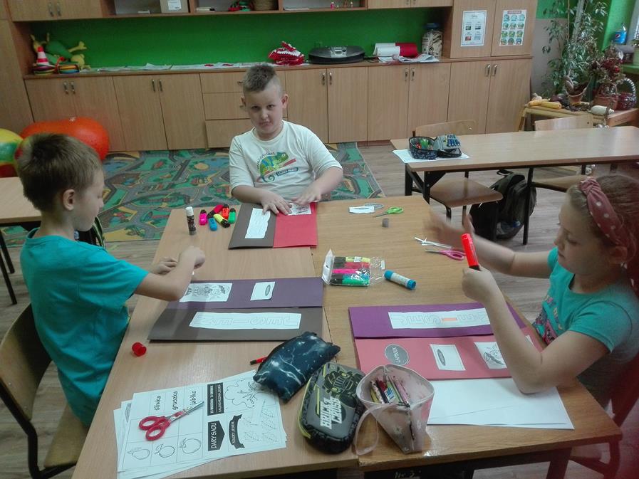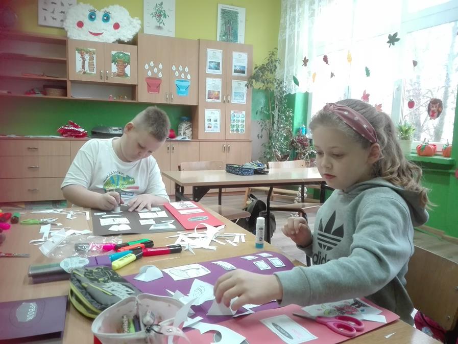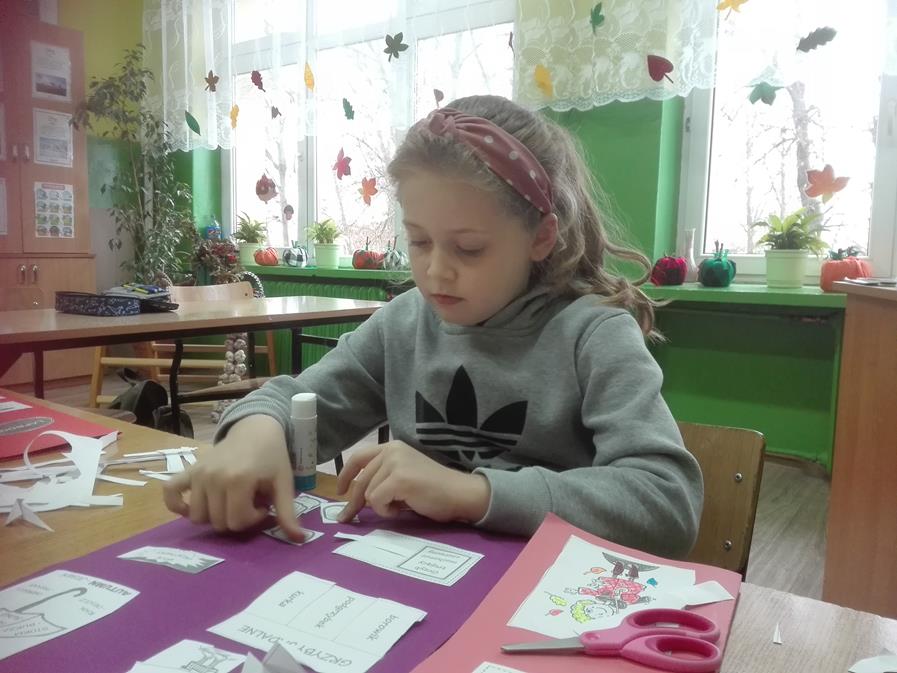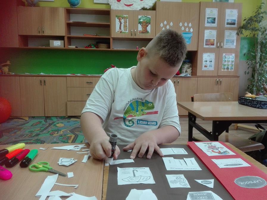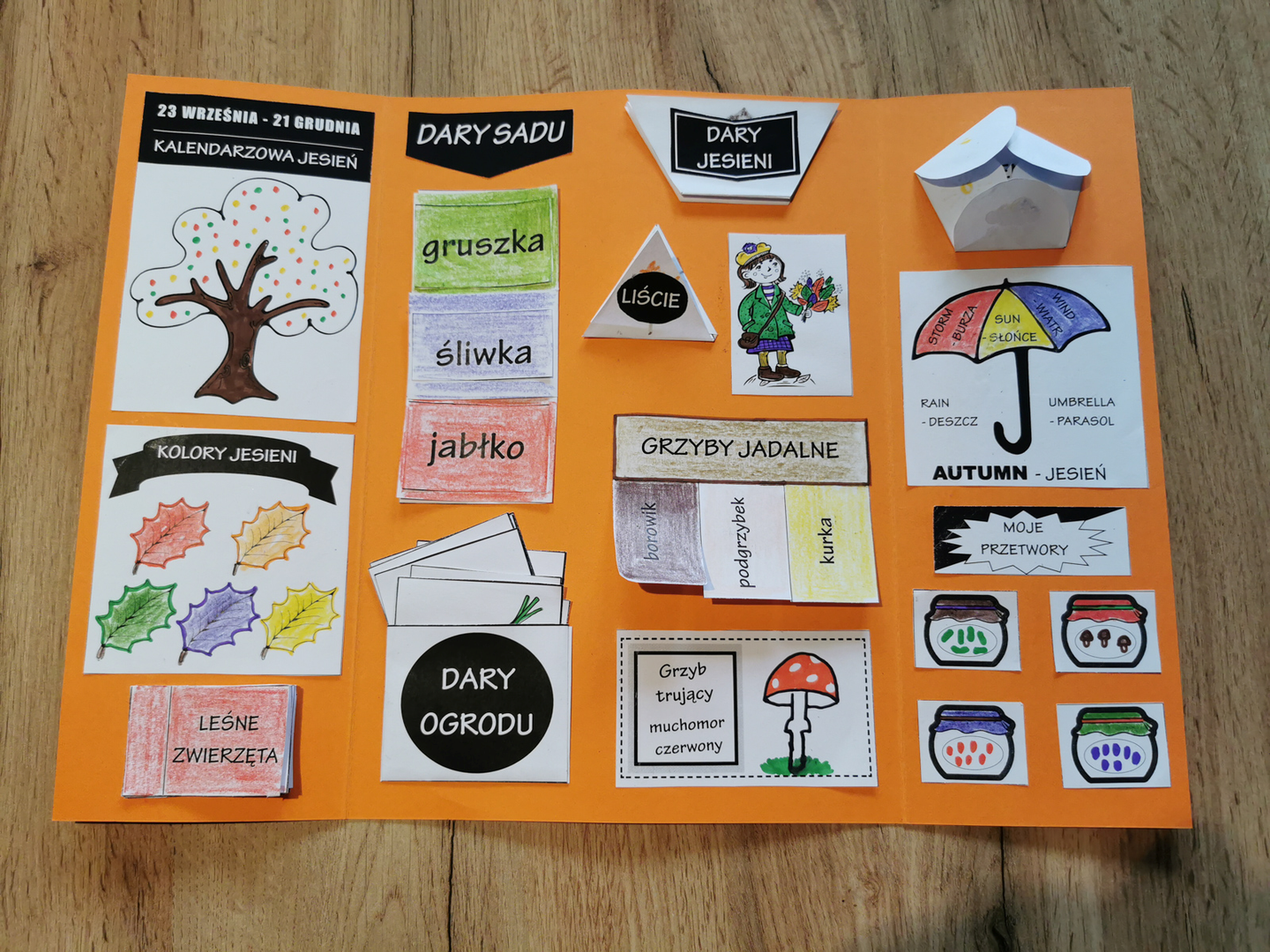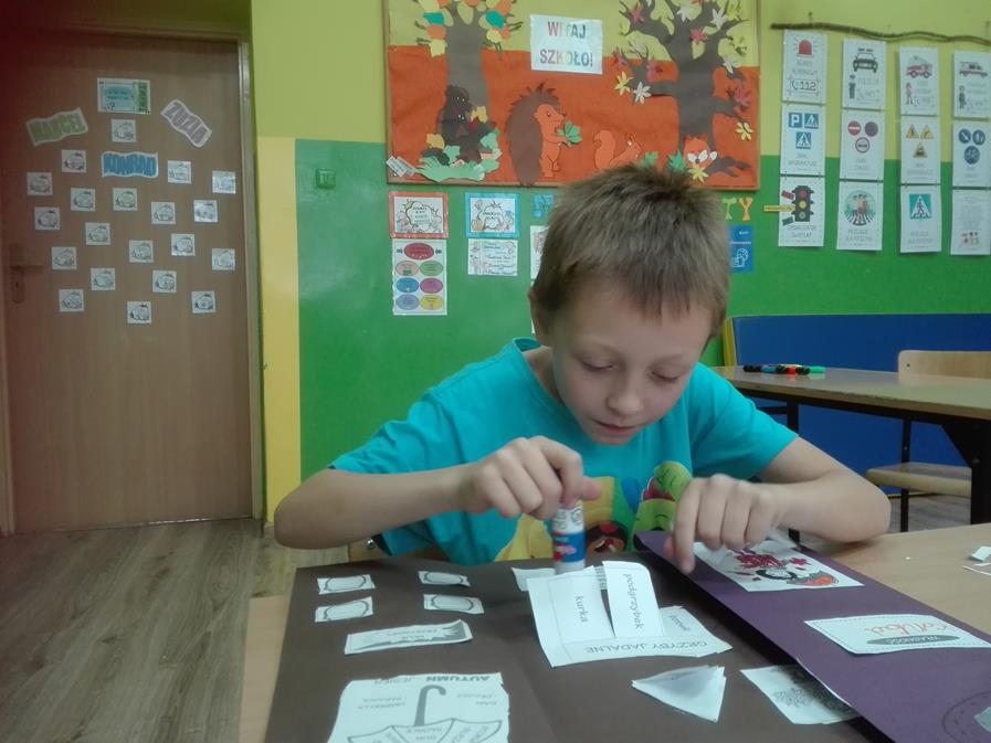 Zuzia, Konrad i Marcel własnoręcznie wykonali pierwsze w swoim życiu lapbooki dotyczące jesieni i związanej z nią pogody, darów z lasu, sadu i ogrodu. Ta metoda nauki bardzo przypadła uczniom do gustu. bo jeżeli w grę wchodzą kredki, pisaki, nożyczki i klej to już wiadomo, ze wtedy jest najlepsza zabawa!