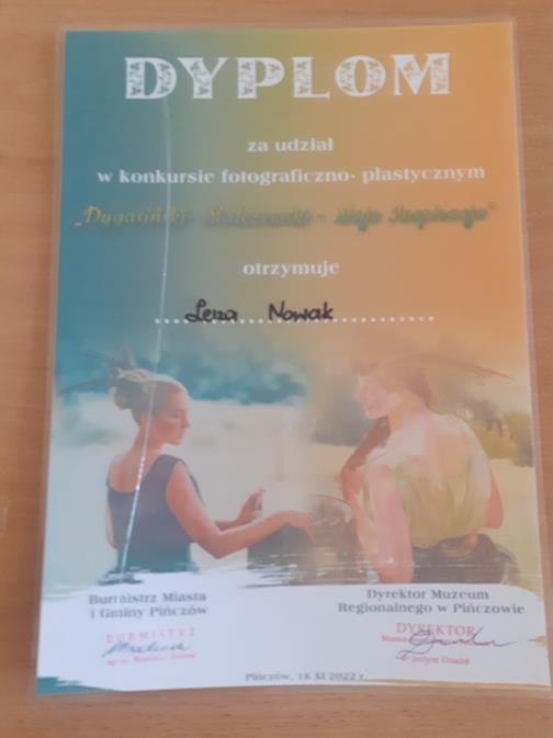 Miło nam poinformować, że uczennica klasy V Lena Nowak reprezentowała naszą szkołę w Konkursie Plastyczno - Fotograficznym ,,Dygasiński - Malczewski - Moje Inspiracje” zorganizowanym przez pracowników Muzeum Regionalnego w Pińczowie. Praca Lenki była bardzo ładna, ciekawa i oryginalna. Nie dziwi, więc fakt, że uczennica otrzymała dyplom, podziękowanie oraz nagrodę za udział w konkursie. Pracę Lenki można podziwiać na stronie naszej szkoły oraz na wystawie w Muzeum Regionalnym w Pińczowie.