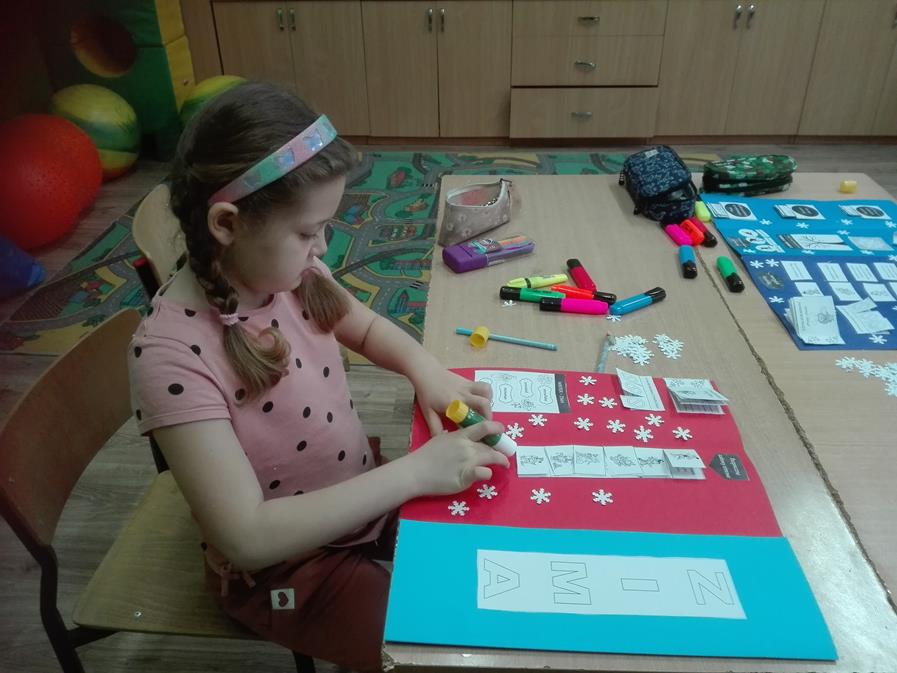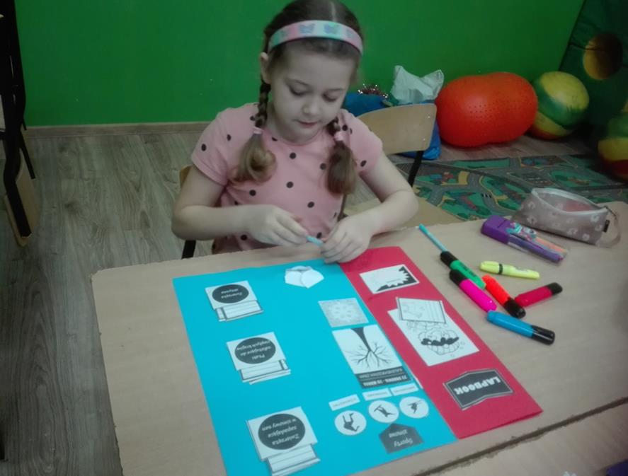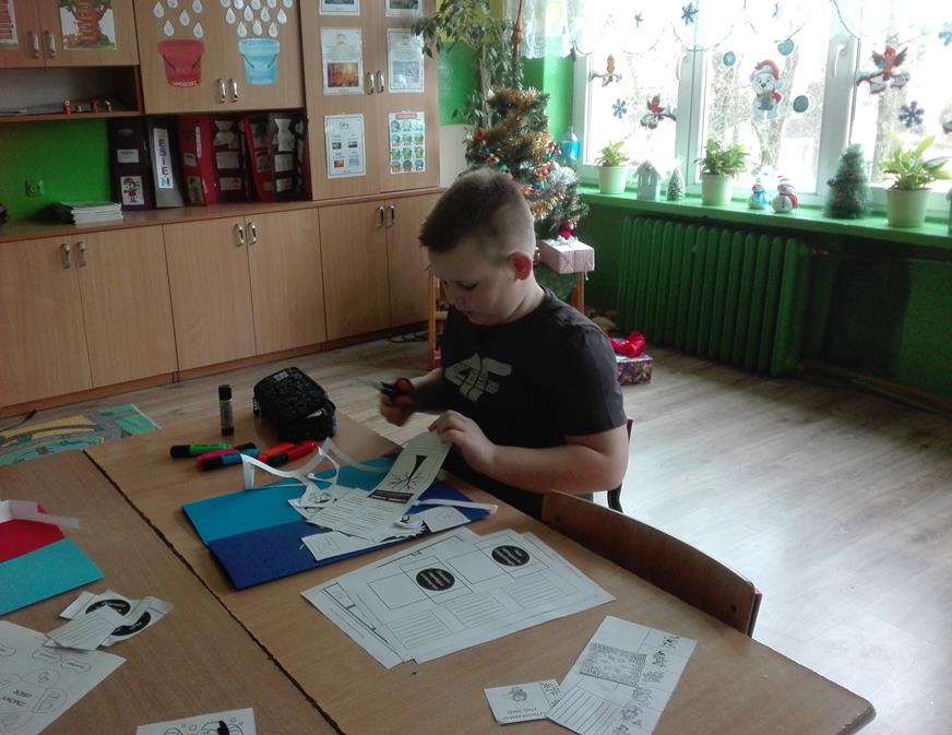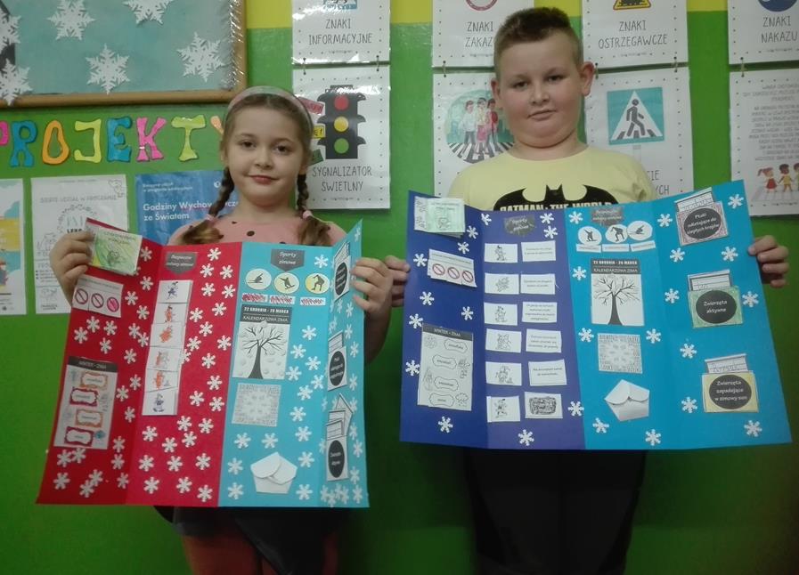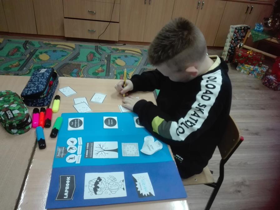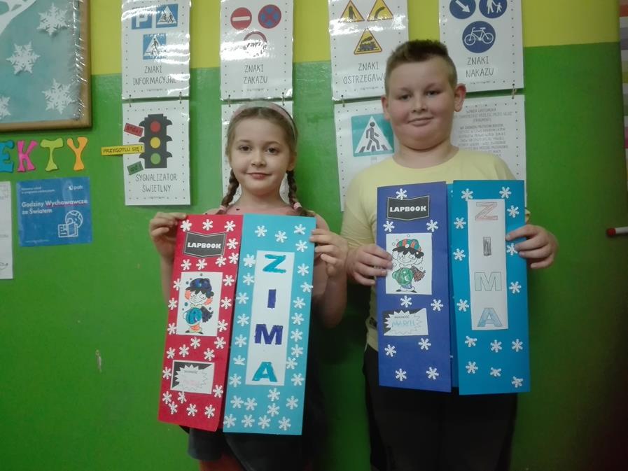W styczniu uczniowie klasy pierwszej wykonali laapbooki, czyli tematyczne książki na temat zimy w ramach innowacji pedagogicznej „Lapbookowa nauka – cztery pory roku." Nasze książki zawierały małe książeczki, koperty, otwierane okienka z informacjami o zimowym stroju, sportach i pogodzie. Ponadto uczniowie nazywali ptaki, zimujące Polsce oraz te, które odleciały do ciepłych krajów. Wypisali nazwy produktów, którymi można i nie można dokarmiać zwierząt podczas zimy. Poznały tez ssaki aktywne i zapadające w sen zimowy. Nauka przez zabawę to najlepszy sposób na poznawanie świata.