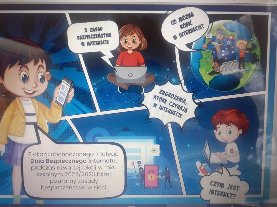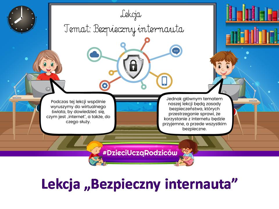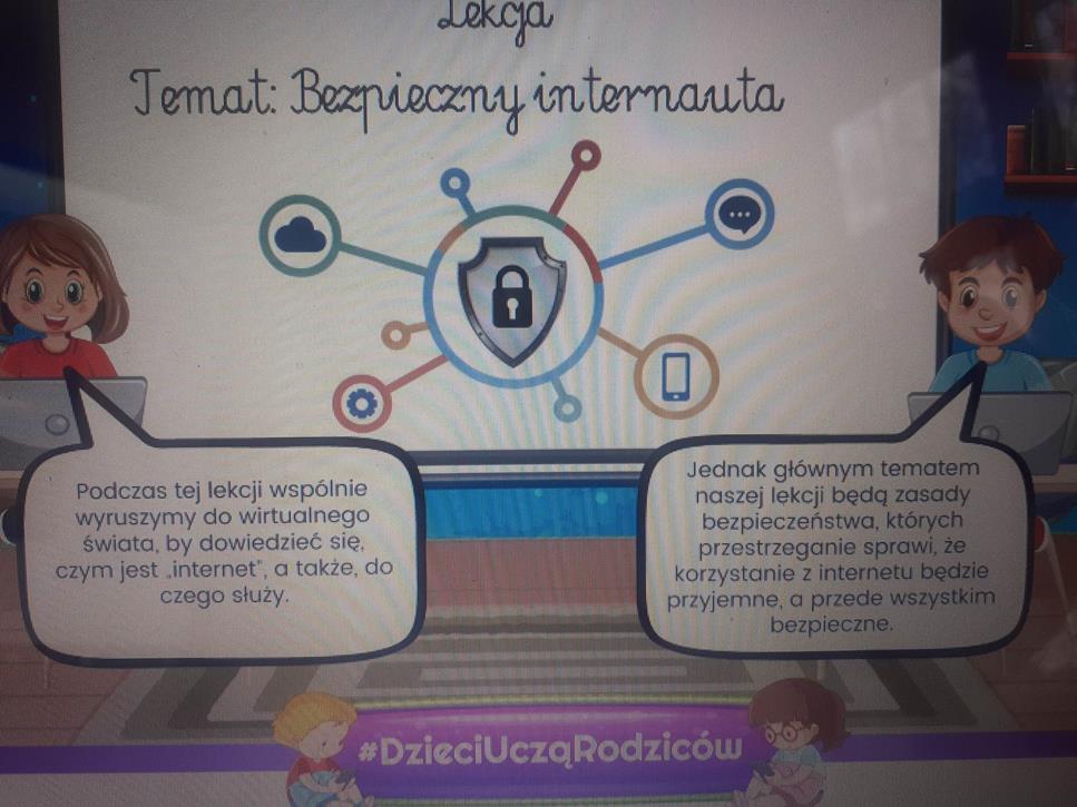 Uczniowie klas II i III wzięli udział w kolejnej - czwartej lekcji z cyklu ,,Dzieci uczą rodziców". Podczas tej lekcji przypomnieli sobie, czym jest Internet i do czego służy. Poznali 5 zasad bezpiecznego korzystania z internetu oraz dowiedzieli się jakie zagrożenia czyhają na nich w Internecie. Po obejrzeniu bardzo ciekawej prezentacji, wypełnili tematyczne karty pracy.