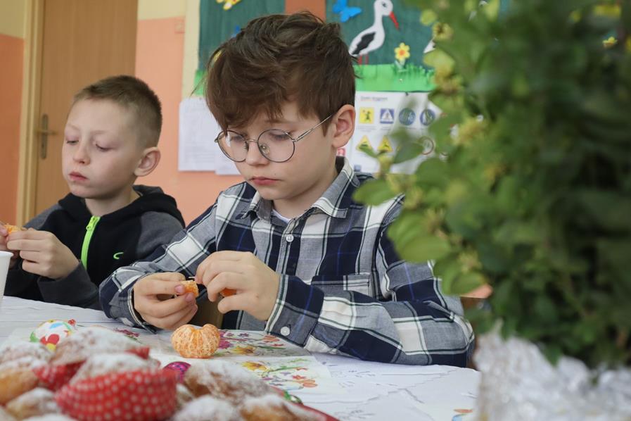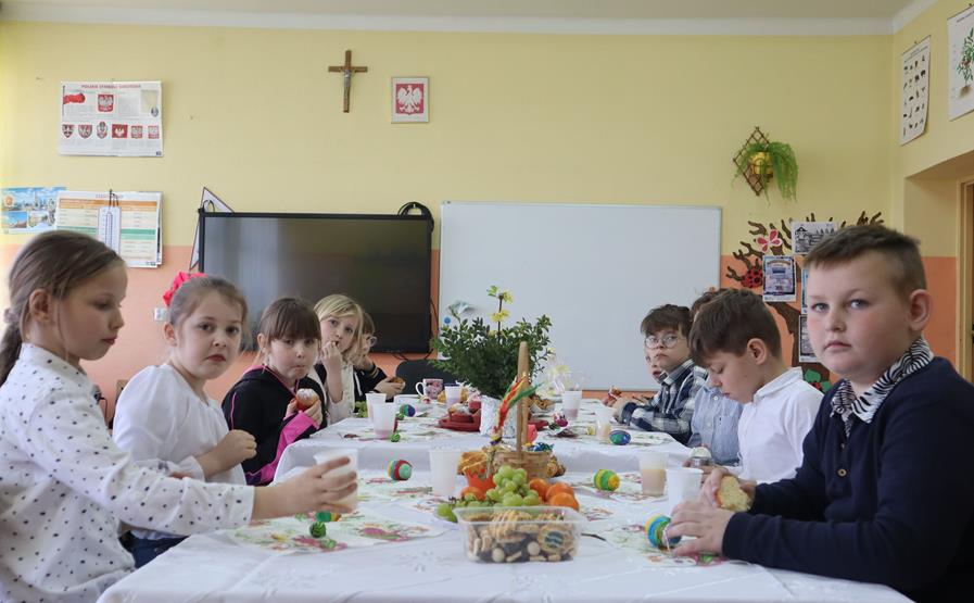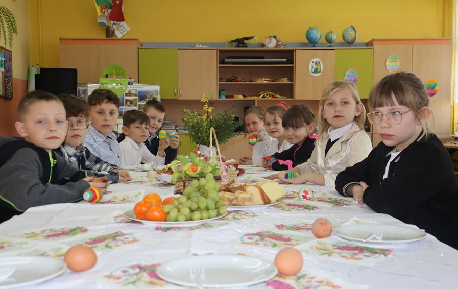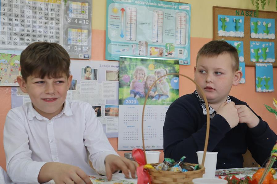 W środę, 5 kwietnia uczniowie z klas I - III uroczyście obchodzili tradycje i zwyczaje wielkanocne przez wspólne dekorowanie stołu, dzielenie się jajkiem i składanie świątecznych życzeń. Później odbył się konkurs, „Co powinno znaleźć się w wielkanocnym koszyczku?" oraz szukanie wokół szkoły jajeczek ze słodkimi niespodziankami, które schował Wielkanocny Zajączek