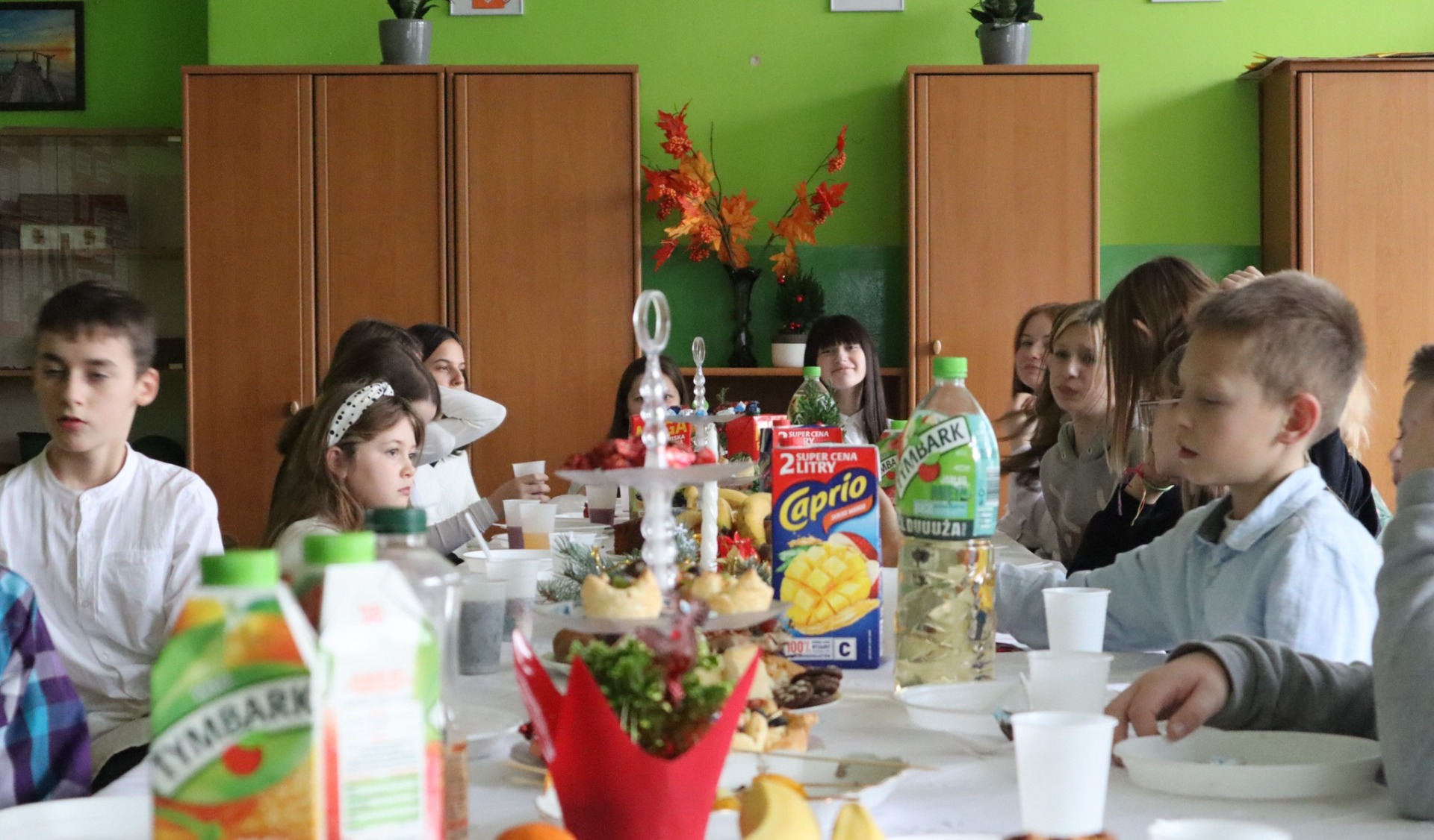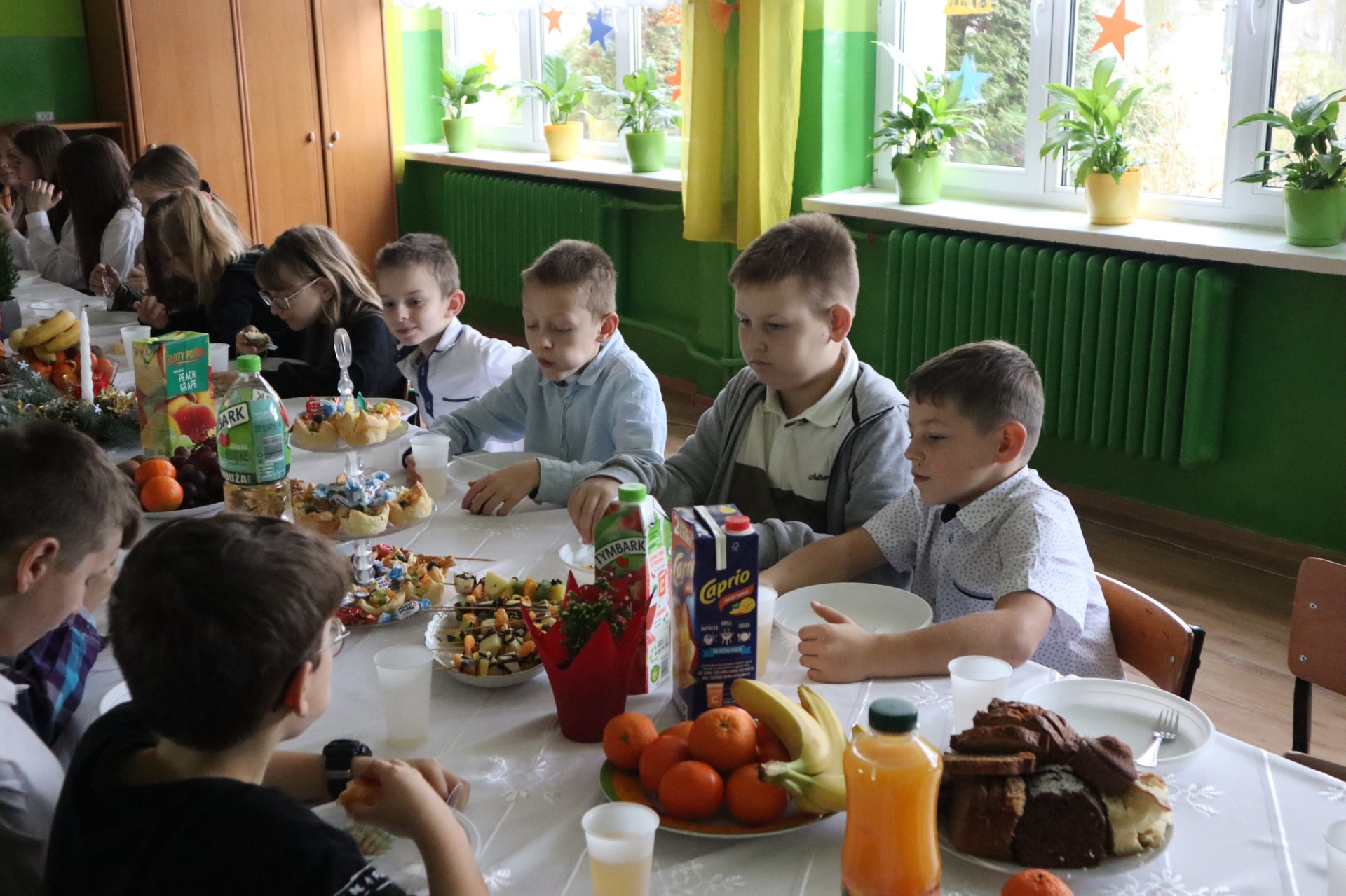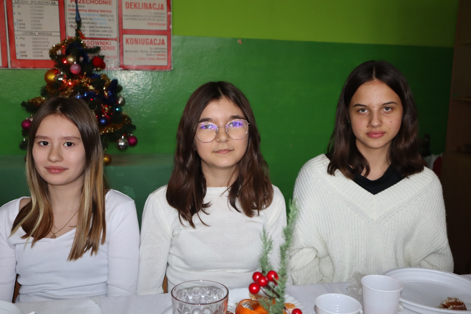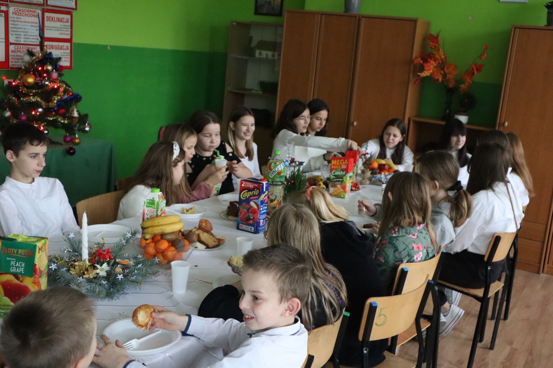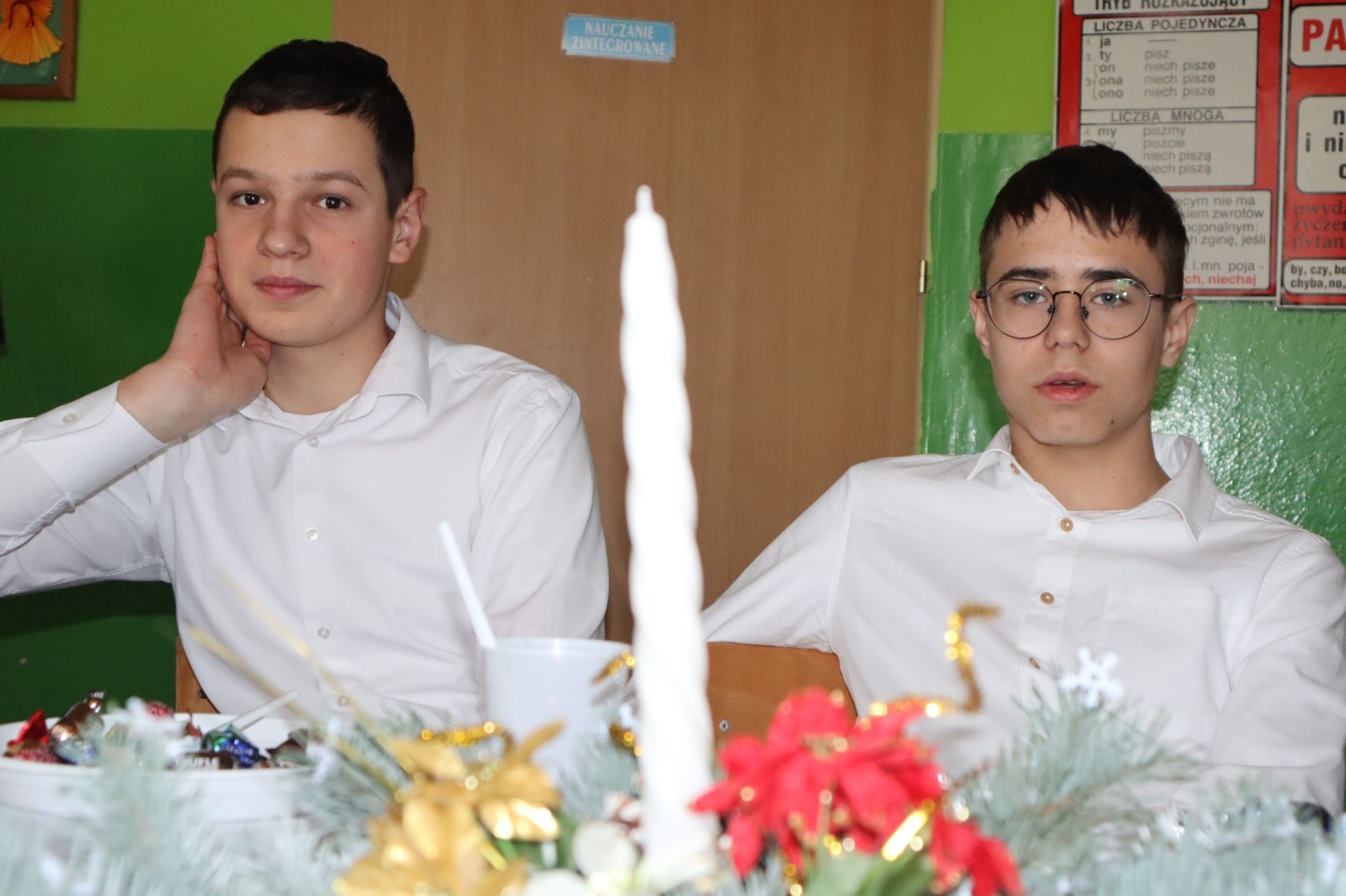 Dnia 22 grudnia odbyło się szkolne spotkanie wigilijne. Przy wspólnym stole usiedli wszyscy uczniowie i nauczyciele. Magię Świąt Bożego Narodzenia czuć było od rana w całej szkole... Dzieliliśmy się opłatkiem składając płynące z serca życzenia, smakowaliśmy tradycyjnych potraw przy dźwiękach świątecznych piosenek kolęd.
