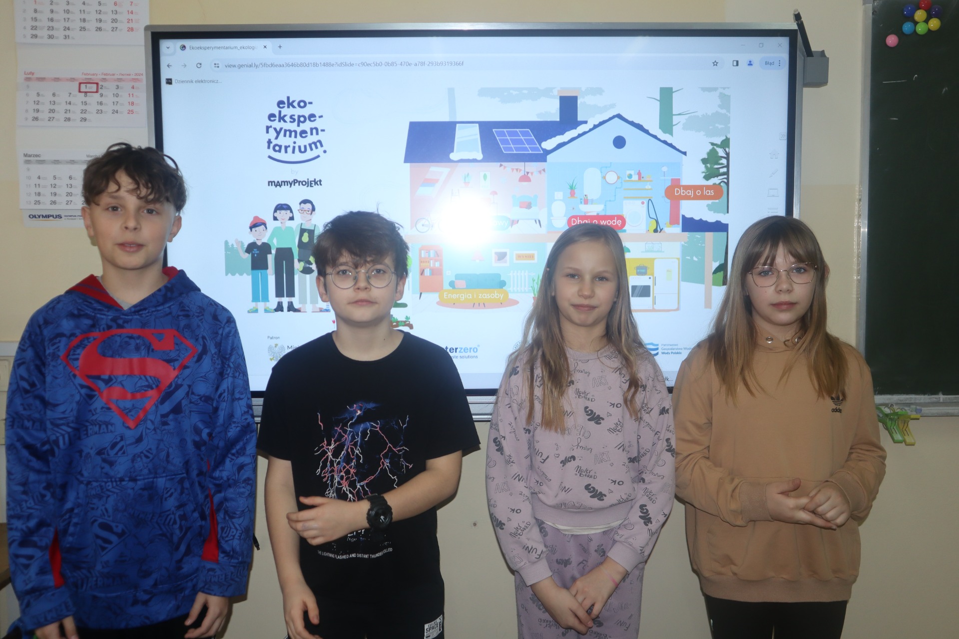 Uczniowie klasy czwartej w pierwszym półroczu podczas zajęć koła krajoznawczo-turystycznego realizowali projekt EkoEksperymentarium z grą on-line, która w nietuzinkowy sposób angażowała w sprawy ekologii. Celem tego przedsięwzięcia jest nauka i rozwijanie dobrych praktyk w dbaniu o planetę. Uczniowie poznali ekologiczne sposoby robienia zakupów, sprzątania i oszczędzania wody i prądu. Jak to zrobili? Grali! Dzięki wizycie w wirtualnym domu rodziny Łaskotków i łamigłówkom ukrytym w jego pokojach uczniowie łatwo zrozumieli, jak wielkie znaczenie dla środowiska ma zmiana drobnych nawyków. Przyszłość Ziemi można zmienić bez wychodzenia z domu! Naprawdę!! Spróbuj!!!