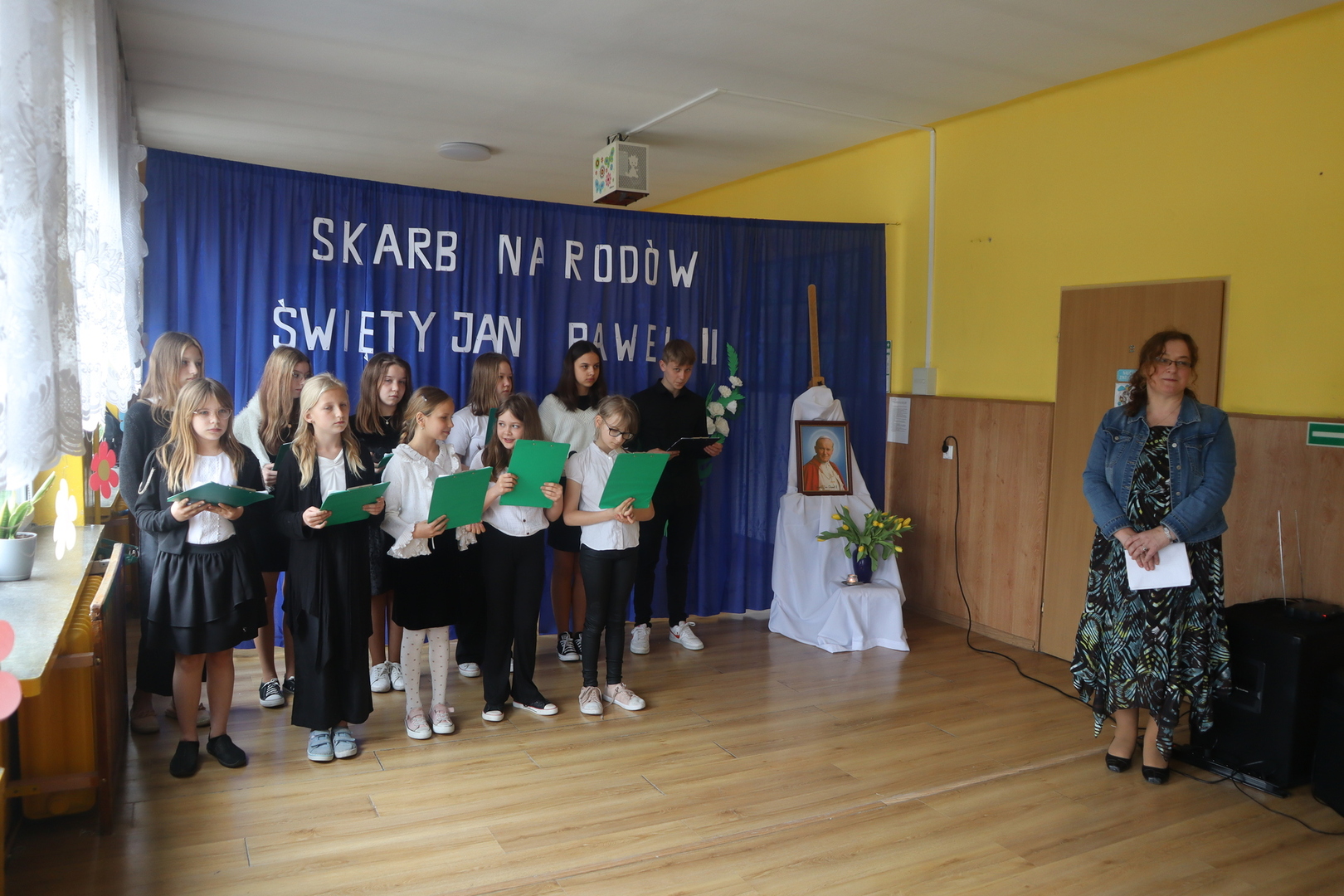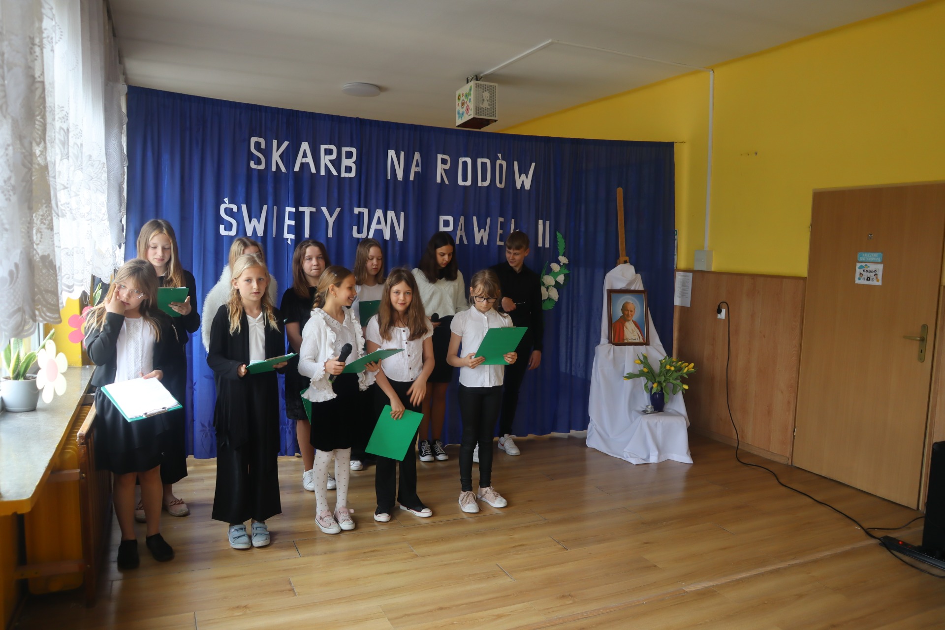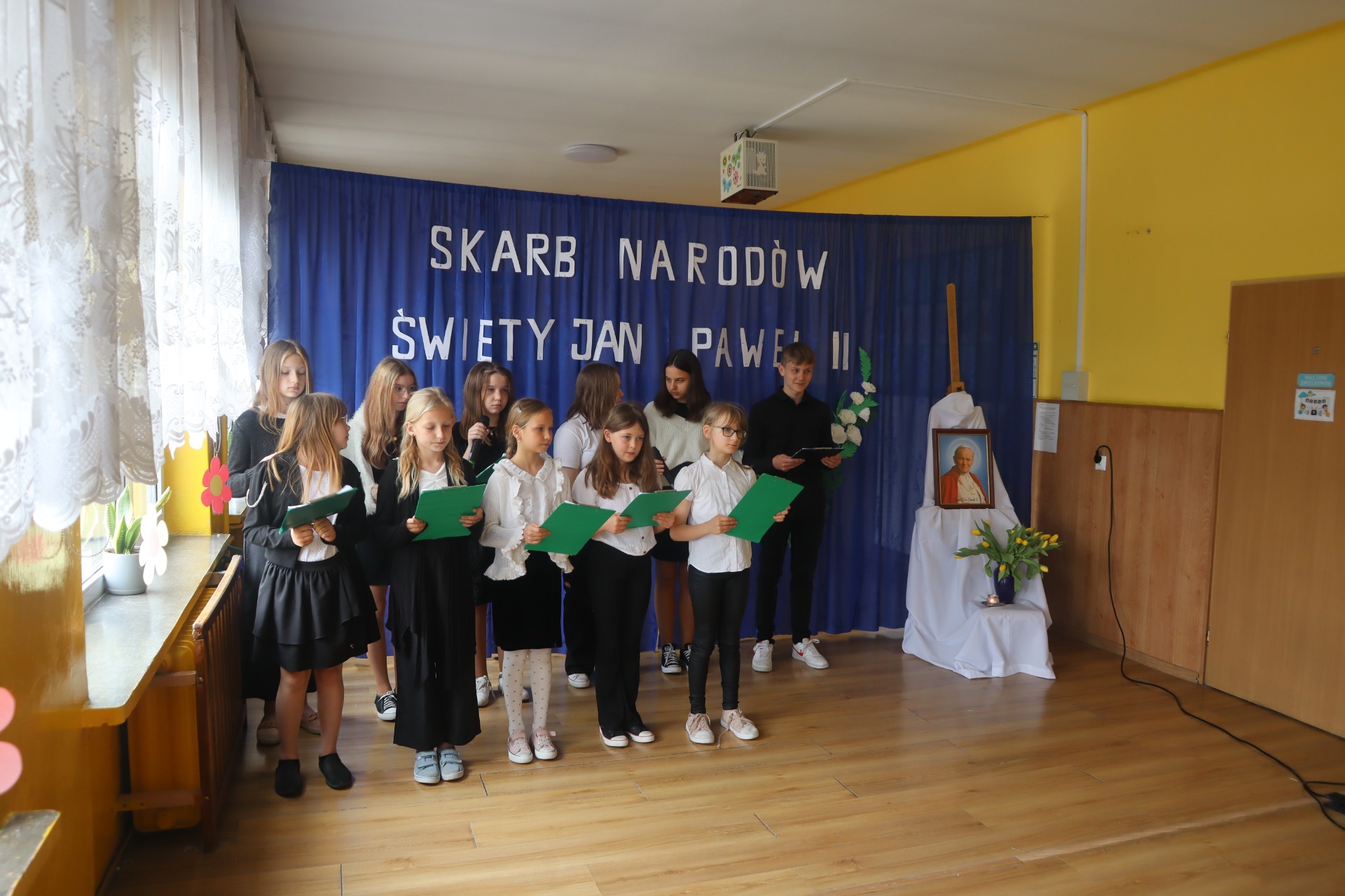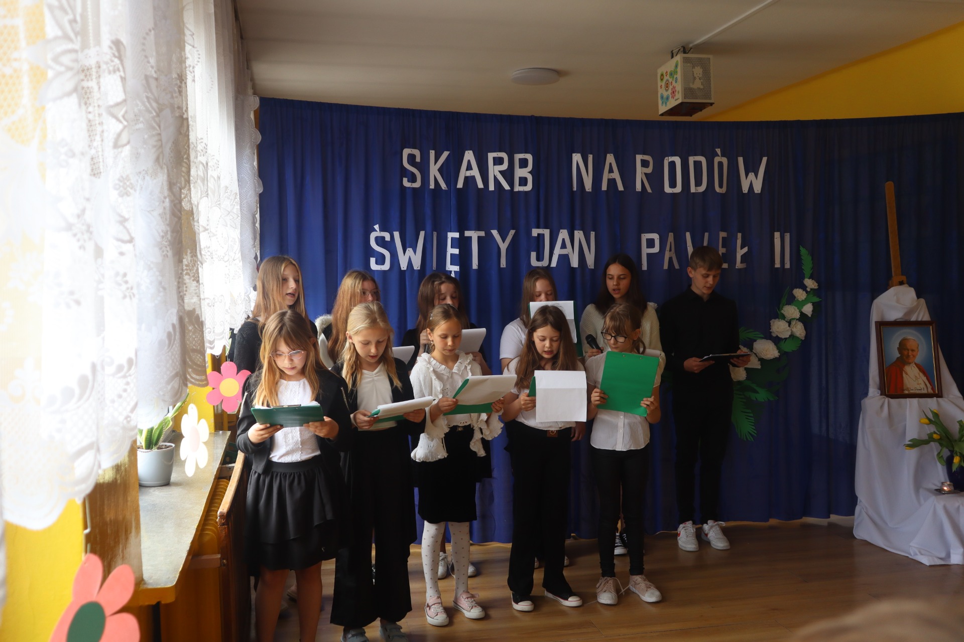 Dzieci i młodzież pod kierunkiem Pani Doroty Grochowskiej przedstawiły program słowno–muzyczny: ,,Skarb narodów – Święty Jan Paweł II".  Przywołane na nowo słowa Papieża, piękne piosenki były nagradzane brawami. W twarzach dorosłych pojawił się uśmiech i skrywane łzy, a dzieci z radością śpiewały: ,,nie ma lepszego od Jana Pawła II”. Wszystko spowodowało niezwykle podniosły nastrój wielkiej chwili- radości, szczęścia i narodowej dumy. W oczach oglądających zakręciły się łzy wzruszenia, gdy w uszach ich brzmiały słowa piosenki: ,,My, polskie dzieci, kochamy Cię”. Na zakończenie wszyscy zaśpiewali ulubioną pieśń Świętego Jana Pawła II: „Barka”.