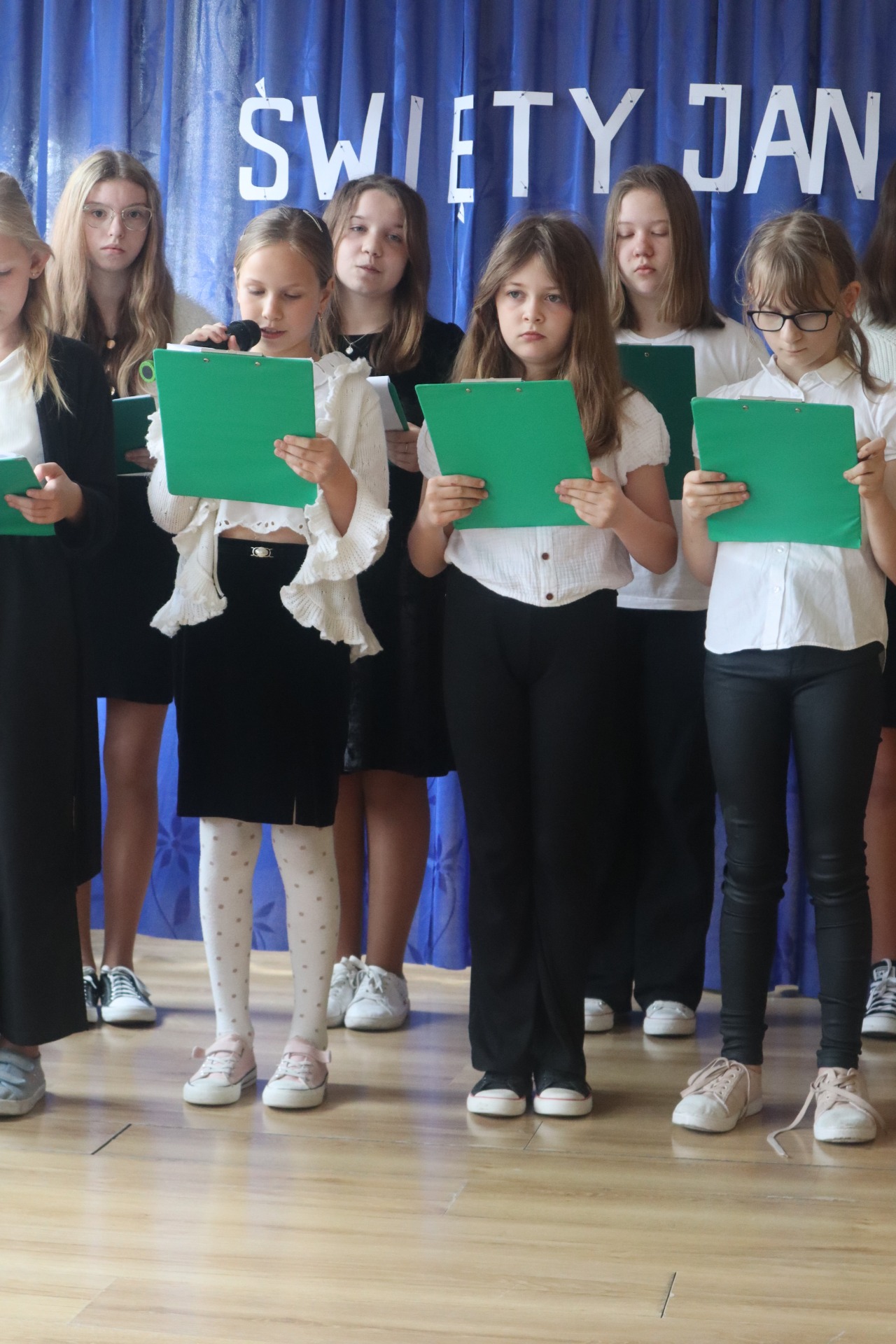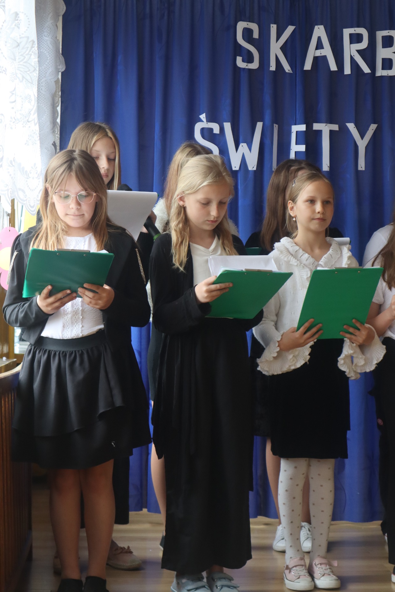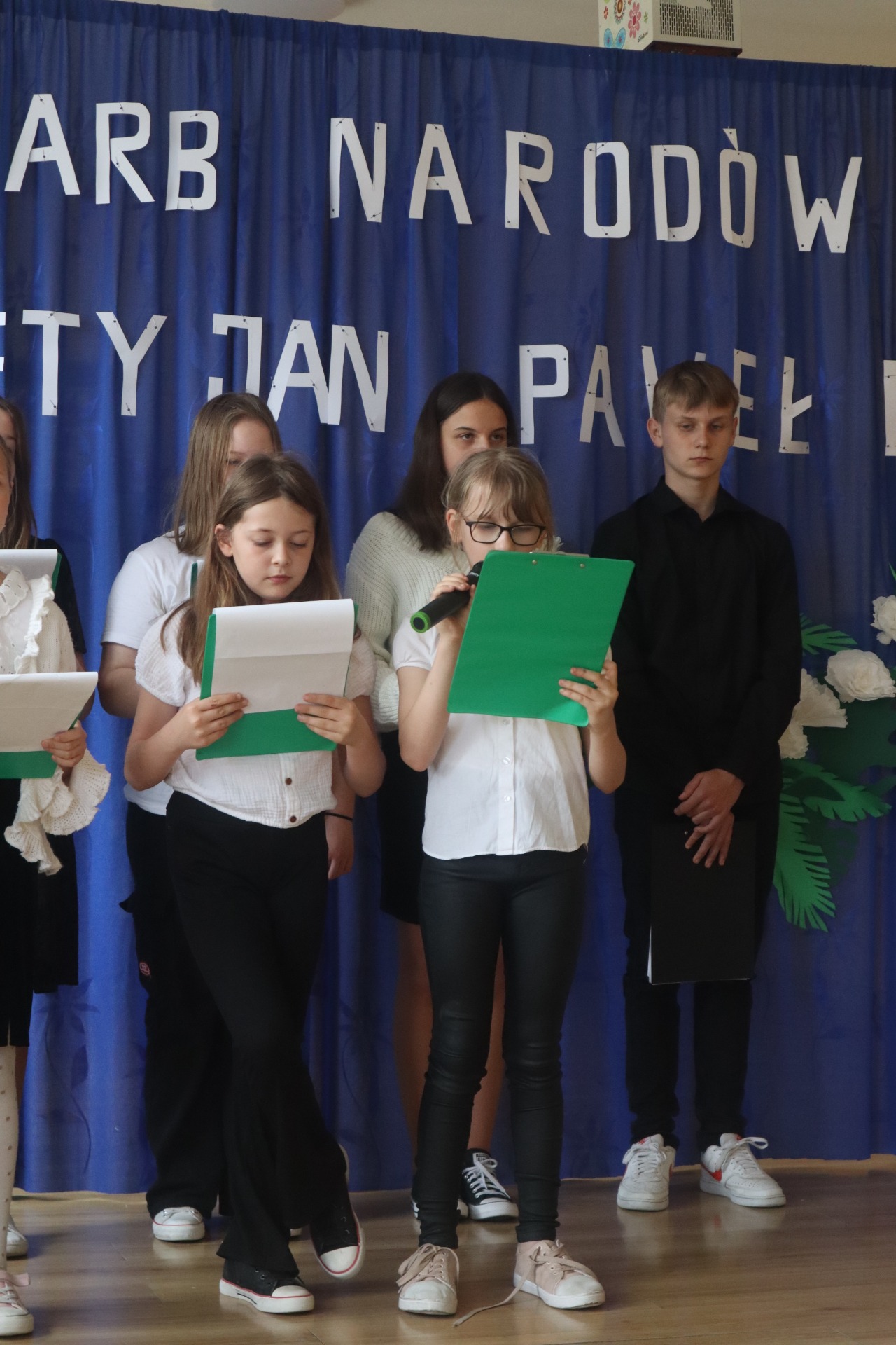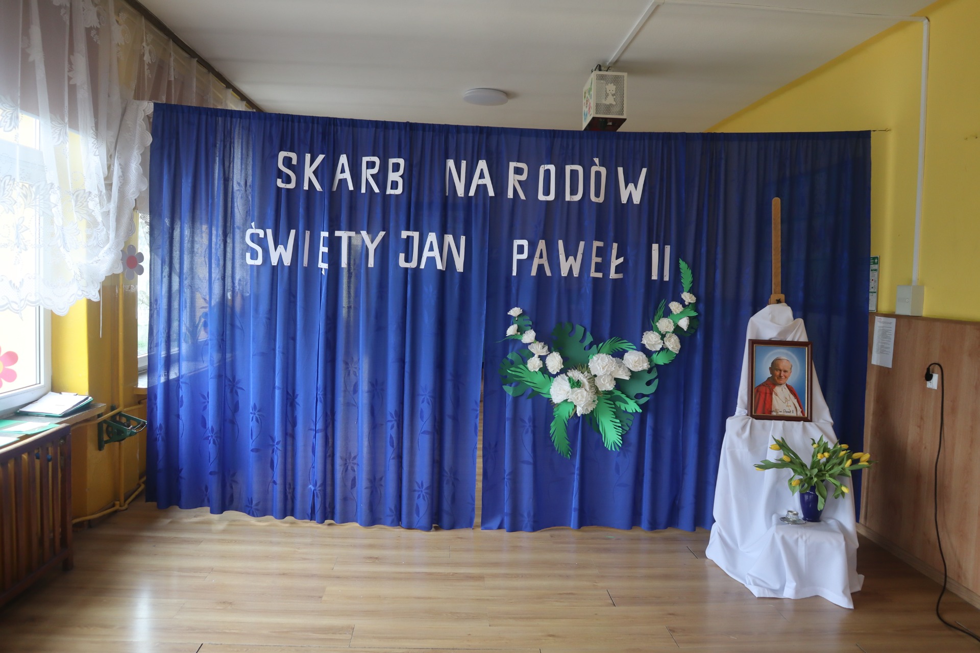 Dzieci i młodzież pod kierunkiem Pani Doroty Grochowskiej przedstawiły program słowno–muzyczny: ,,Skarb narodów – Święty Jan Paweł II".  Przywołane na nowo słowa Papieża, piękne piosenki były nagradzane brawami. W twarzach dorosłych pojawił się uśmiech i skrywane łzy, a dzieci z radością śpiewały: ,,nie ma lepszego od Jana Pawła II”. Wszystko spowodowało niezwykle podniosły nastrój wielkiej chwili- radości, szczęścia i narodowej dumy. W oczach oglądających zakręciły się łzy wzruszenia, gdy w uszach ich brzmiały słowa piosenki: ,,My, polskie dzieci, kochamy Cię”. Na zakończenie wszyscy zaśpiewali ulubioną pieśń Świętego Jana Pawła II: „Barka”.
