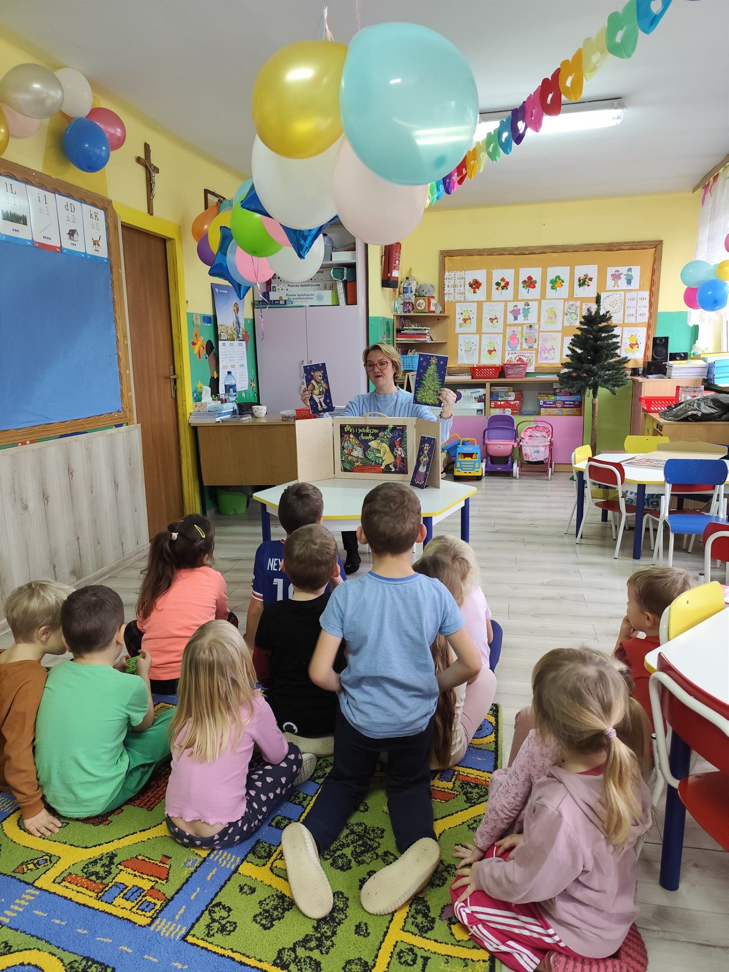 4 grudnia naszą szkołę odwiedziła pani Joanna Strączek-Dziabała, bibliotekarka z Filii Miejsko-Gminnej Biblioteki Publicznej w Gackach. Spotkania z uczniami klas I-III oraz przedszkolakami przebiegły w bożonarodzeniowej atmosferze – dzieci z zainteresowaniem obejrzały teatrzyki kamishibai o tematyce świątecznej. Starsi uczniowie z klas IV-VI uczestniczyli w prelekcji o relacjach interpersonalnych i bezpiecznym korzystaniu z internetu, aktywnie angażując się w dyskusję.