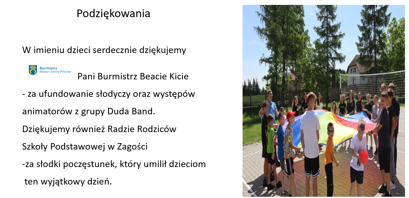 W tym dniu rodzice, dziadkowie, opiekunowie starają się sprawić dzieciom przyjemność i organizują im różne zabawy, wycieczki, festyny, pikniki. Tak oczywiście było i w Szkole Podstawowej w Zagości dnia 2 czerwca. Pani Burmistrz miasta Pińczów, Beata Kita, zafundowała animatorów, grupę Duda Band, aby organizowała dla uczniów różne ciekawe konkursy , a także zabawy. Dzieci, podzielone na dwie grupy : najpierw przedszkolaki , a także zerówkowicze, a potem dzieci klas I do VIII , świetnie bawiły się na boisku szkolnym. Czegóż tu nie było?- no więc mydlane banki, przeciąganie liny, siatkówka, skoki przez linę, układanie figur geometrycznych……to tylko niektóre z atrakcji przygotowane przez Duda Band. Pani Burmistrz osobiście dostarczyła dla dzieci słodycze, a Rada Rodziców ufundowała słodki poczęstunek. W imieniu dzieci składamy serdeczne podziękowania zarówno dla Pani Burmistrz -Beaty Kity, jak również i Rady Rodziców Szkoły Podstawowej w Zagości.