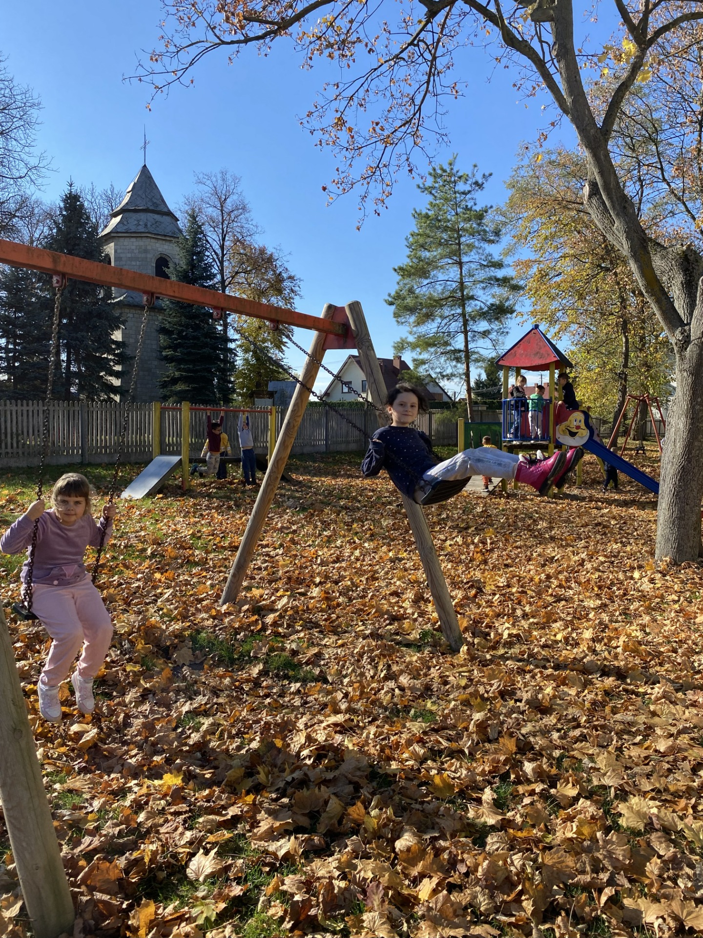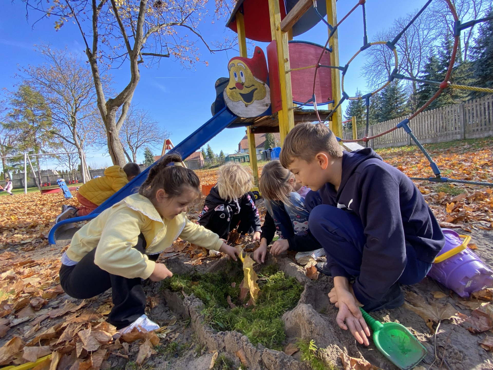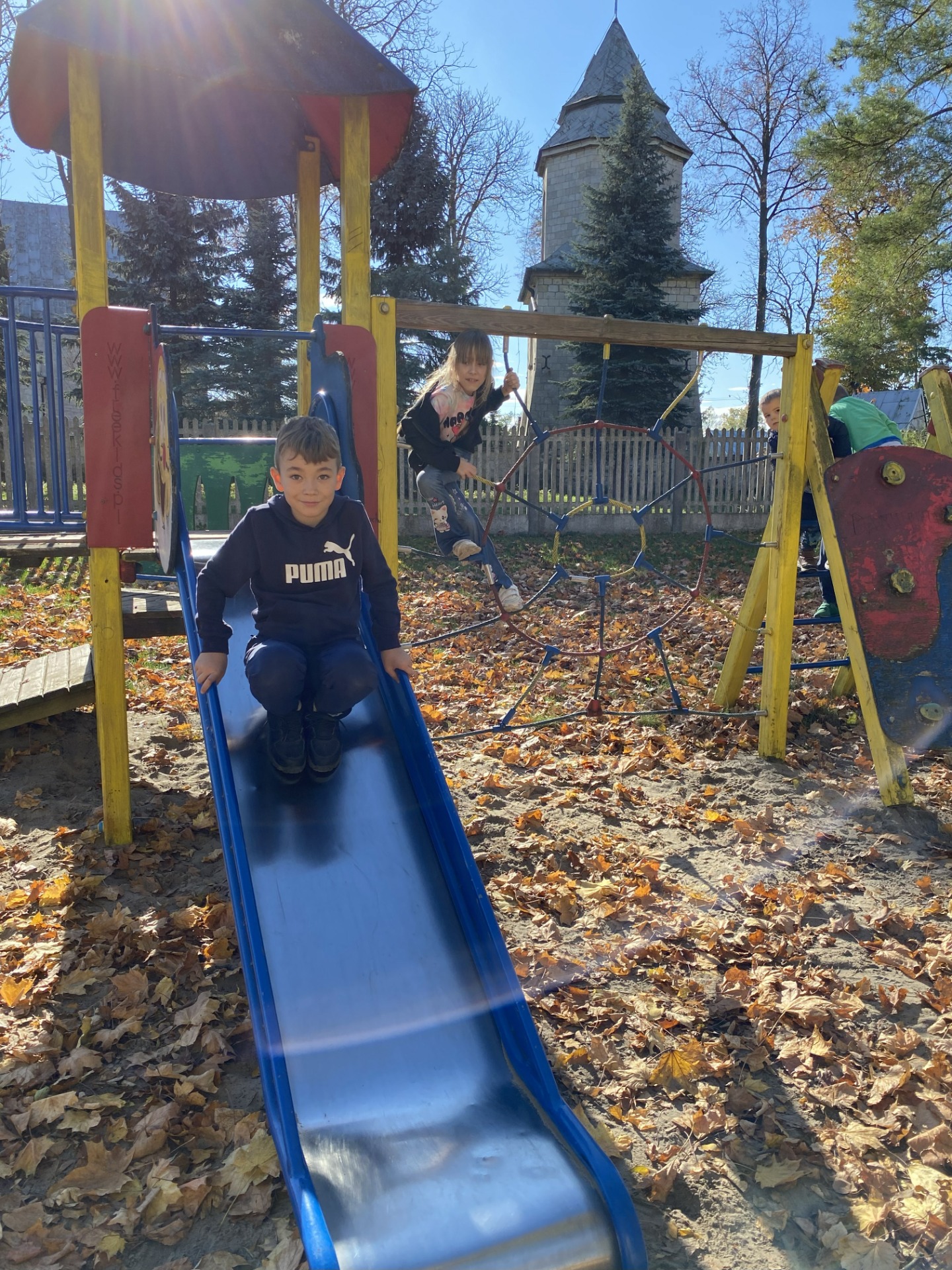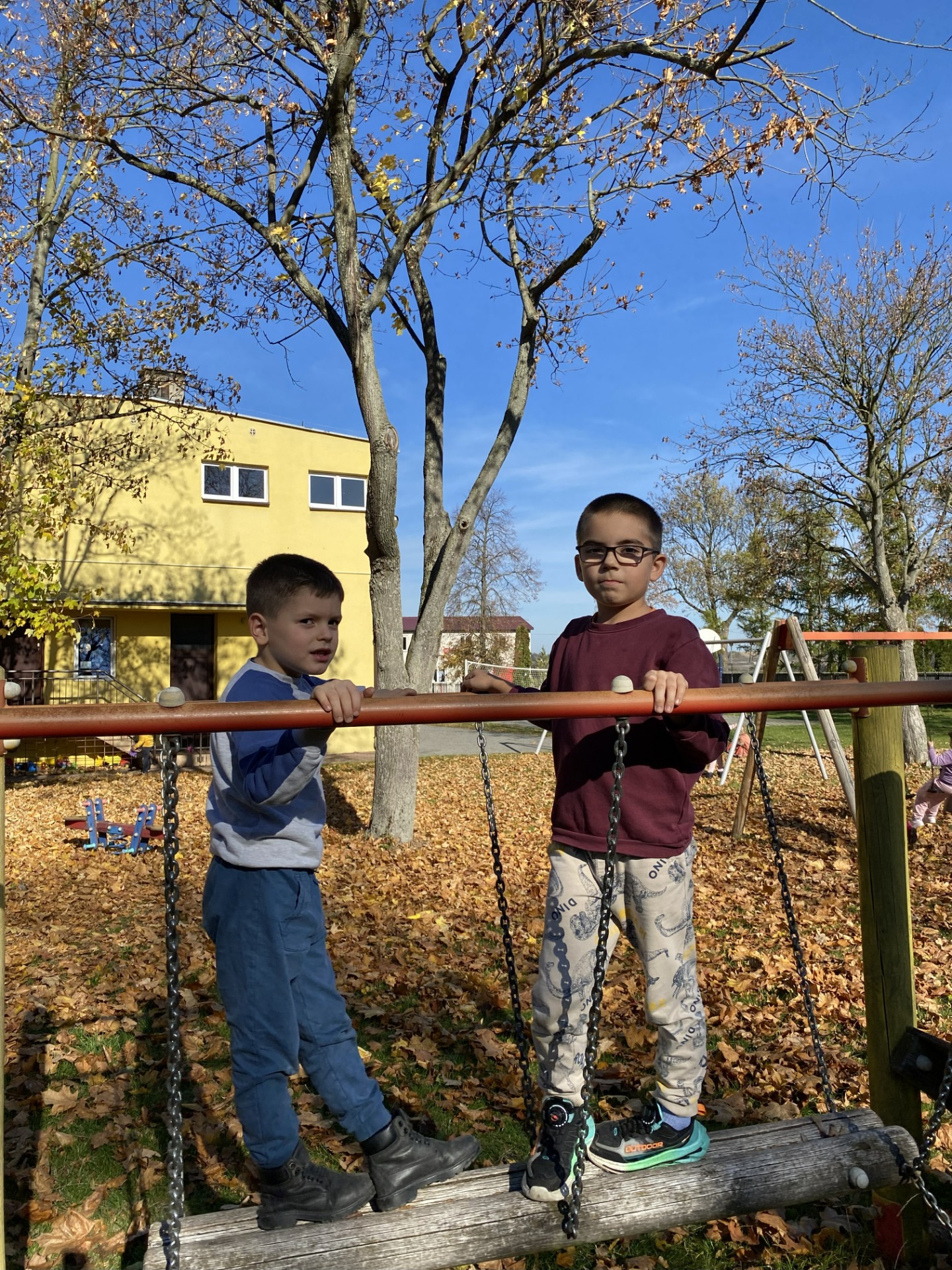 Uczniowie klas I–II wspaniale spędzili czas na szkolnym placu zabaw podczas zajęć świetlicowych. W piękny, słoneczny, jesienny dzień bawili się wśród kolorowych liści, korzystając z huśtawek, zjeżdżalni i wspólnych zabaw na świeżym powietrzu. Podczas zabawy integrowali się także z przedszkolakami, wspólnie tworząc radosną, pełną śmiechu atmosferę. To był naprawdę udany, jesienny dzień pełen słońca i uśmiechów!