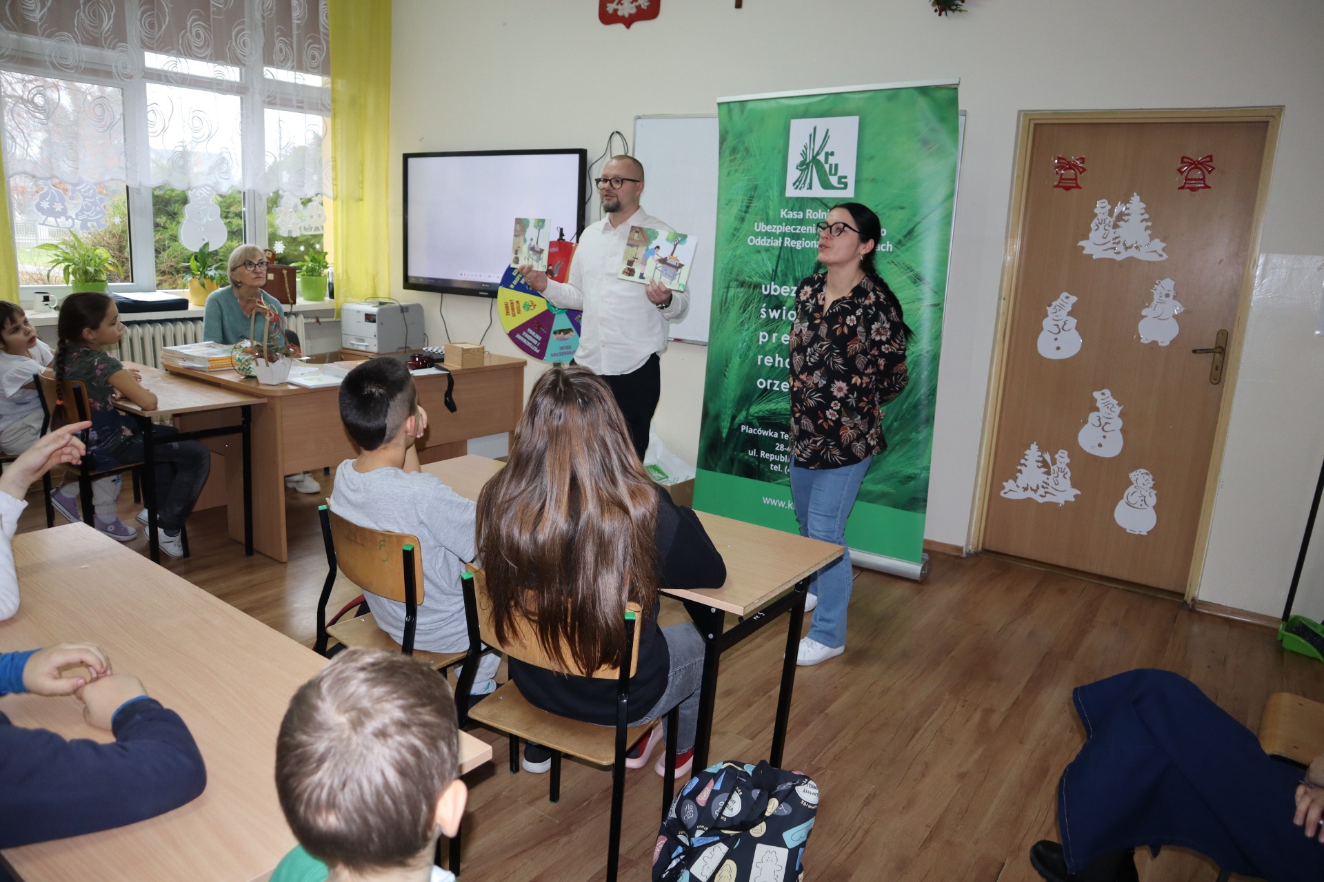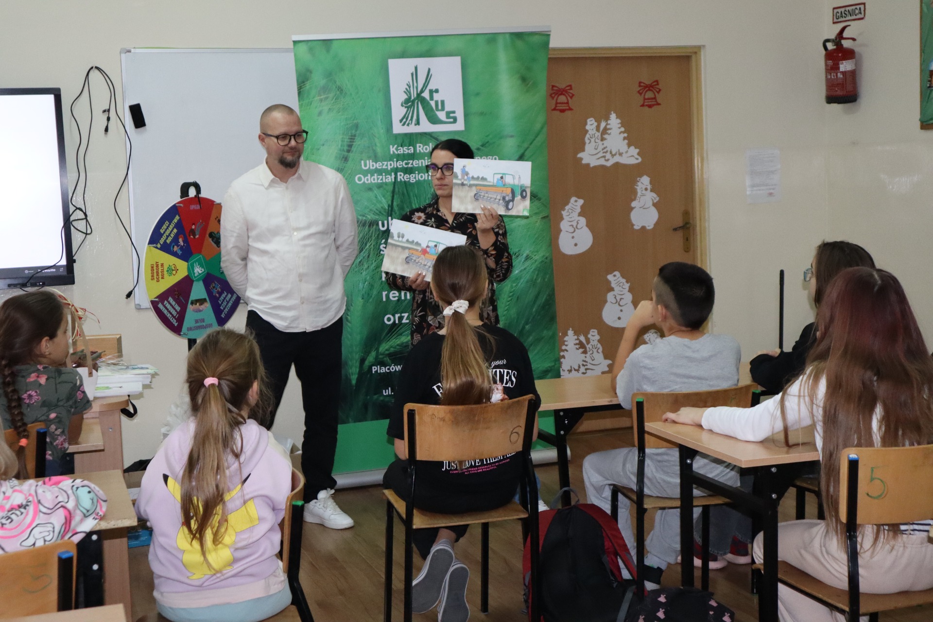 Dnia 02.12.2025 roku Szkołę Podstawową w Zagości odwiedzili pracownicy KRUS-u , Oddział w Pińczowie, Państwo: A. Strzelecka i Ł. Chmielewski z bardzo ciekawymi warsztatami skierowanymi do uczniów wszystkich klas. Cel warsztatów to zagadnienia związane z bezpieczeństwem w rolnictwie. Prowadzący mieli do spełnienia bardzo ważne zadanie, mianowicie uświadomienie dzieci, jakie działania podejmowane przez nie w obrębie własnych podwórek zagrażają ich zdrowiu, czy też życiu.